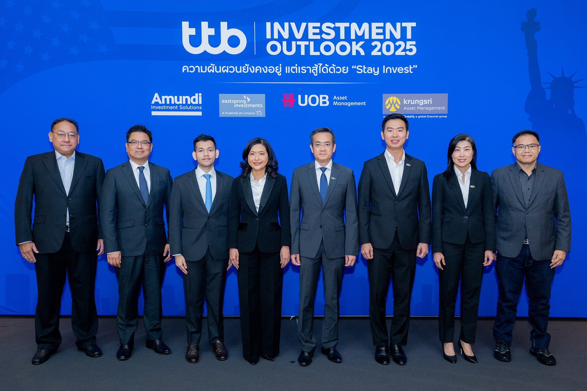 ทีเอ็มบีธนชาต หรือ ทีทีบี นำโดย นายนาวิน อินทรสมบัติ (ที่ 5 จากซ้าย) รองประธานเจ้าหน้าที่บริหาร หัวหน้าบริหารการลงทุน พร้อมทีมผู้บริหาร ยกกองทัพกูรูและผู้เชี่ยวชาญด้านการลงทุนจากทีทีบีและพันธมิตร ได้แก่ บริษัทหลักทรัพย์นายหน้าซื้อขายหน่วยลงทุนอมุนดิ (ประเทศไทย) จำกัด, บริษัทหลักทรัพย์จัดการกองทุน อีสท์สปริง (ประเทศไทย) จำกัด, บริษัทหลักทรัพย์จัดการกองทุน ยูโอบี (ประเทศไทย) จำกัด และบริษัทหลักทรัพย์จัดการกองทุน กรุงศรี จำกัด ร่วมจัดงานสัมมนา “ttb investment outlook 2025 ความผันผวนยังคงอยู่แต่เราสู้ได้ด้วย Stay Invest” อัปเดต Market Outlook ในครึ่งแรกของปี 2025 พร้อมวิเคราะห์ความผันผวนของตลาด เปิดมุมมองและทิศทางการลงทุนที่น่าสนใจในครึ่งหลังปี 2025 เพื่อสร้างโอกาสการลงทุนให้ตอบโจทย์ทุกเป้าหมายการเงิน ให้ลูกค้า Wealth สามารถนำไปประกอบการพิจารณาลงทุนในกองทุนต่าง ๆ และได้รับผลตอบแทนที่ดีจากการลงทุน เพื่อนำไปสู่การมีชีวิตทางการเงินที่ดีขึ้นทั้งในวันนี้และอนาคต ณ โรงแรมสยามเคมปินสกี้ กรุงเทพฯ เมื่อเร็ว ๆ นี้