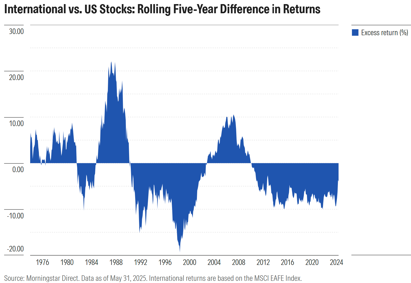 ตลอดระยะเวลาหลายปีที่ผ่านมา หุ้นต่างประเทศได้ผ่านช่วงเวลาหลายปีที่ให้ผลตอบแทนสูงกว่าหรือด้อยกว่าหุ้นสหรัฐฯ สลับกันไป ซึ่งเกิดจากหลายปัจจัย เช่น ความแตกต่างด้านการเติบโตทางเศรษฐกิจ แนวโน้มของอัตราแลกเปลี่ยนเงินตรา และการเปลี่ยนแปลงของมูลค่าหุ้น (Valuation) ตัวอย่างจากกราฟด้านล่าง หุ้นต่างประเทศเคยแซงหน้าหุ้นสหรัฐฯ มาแล้วหลายช่วงเวลา สะท้อนว่าหุ้นต่างประเทศก็มีวัฏจักรของมัน และอาจกลับมาโดดเด่นได้ในบางช่วงของประวัติศาสตร์การลงทุน