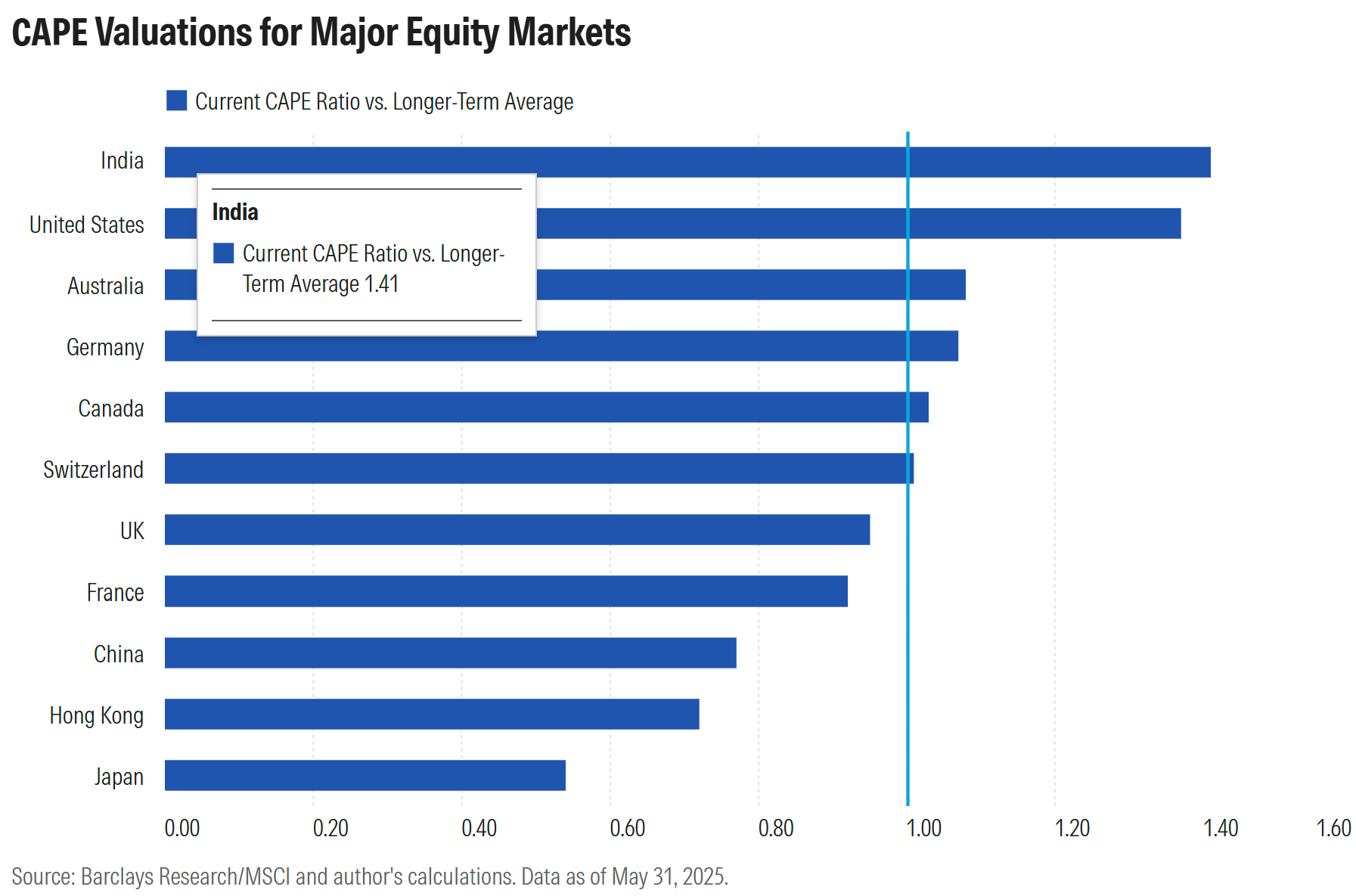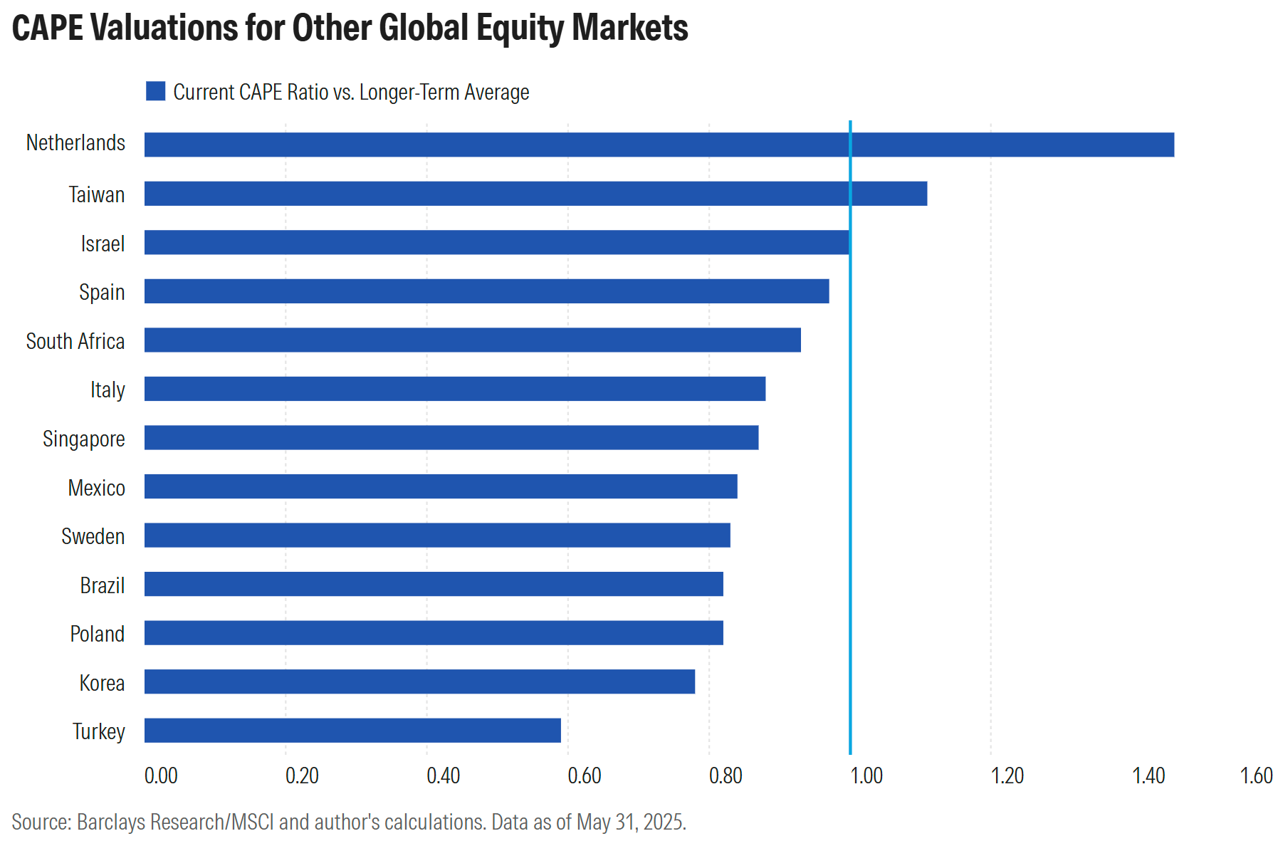 แม้ว่าตลาดหุ้นสหรัฐฯ จะซื้อขายอยู่ในระดับพรีเมียมสูงเมื่อเทียบกับค่าเฉลี่ยในอดีต แต่ในทางกลับกัน ตลาดหุ้นขนาดเล็กหลายแห่งทั่วโลกกลับมีค่า CAPE ต่ำกว่าค่าเฉลี่ยในอดีตของตัวเอง