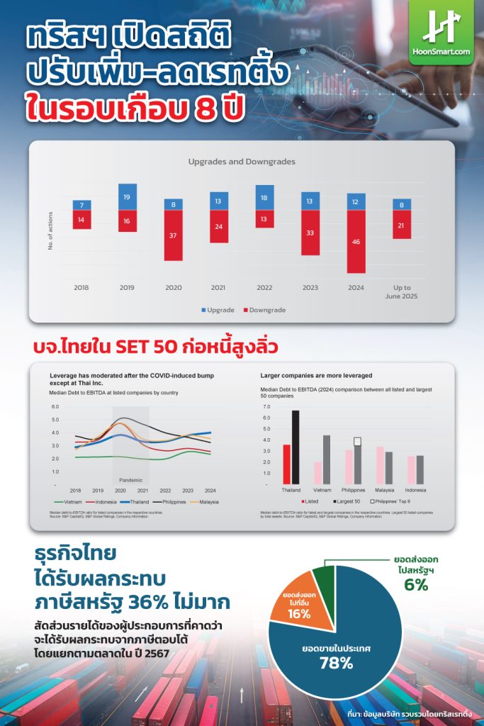 HoonSmart.com>>”ทริสเรทติ้ง”พุ่งเป้า 3 ธุรกิจ อสังหาริมทรัพย์,ไฟฟ้าขนาดเล็ก,สินเชื่อรายย่อย เจอแรงกดดันเพิ่มขึ้น หากไม่ปรับตัว 6-12 เดือนมีสิทธิถูกลดเรทติ้ง แนะทางออกเข้าหาแบงก์ใช้สินเชื่อ เตรียมแหล่งเงินล่วงหน้า 6 เดือนก่อนหุ้นกู้ครบอายุ ขายทรัพย์สินลดภาระหนี้ แฉบจ.ใน SET 50 ก่อหนี้สูง 5-6 เท่าของอีบิทดา เทียบภูมิภาค 2-3 เท่า ภาษีสหรัฐมีผลตรงลูกค้า 225 รายจิ๊บจ๊อย 7 บริษัท TU, CPF, BTG,STA, STGT, TEGH,SNC ส่งออก กระทบแค่ 4.4%ของรายได้รวม  1 ล้านล้านบาทปี 67