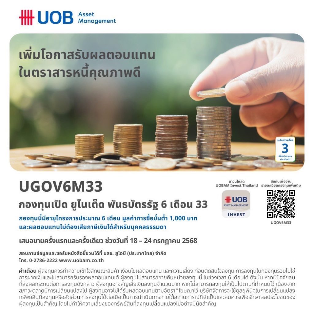 บริษัทหลักทรัพย์จัดการกองทุน (บลจ.) ยูโอบี (ประเทศไทย) จำกัด เปิดเสนอขายหน่วยลงทุนครั้งแรก (IPO) กองทุนเปิด ยูไนเต็ด พันธบัตรรัฐ 6 เดือน 33 (UGOV6M33) อายุประมาณ 6 เดือน มีประมาณการผลตอบแทน 1.25% ต่อปี (ข้อมูลจากอัตราผลตอบแทนที่เสนอโดยผู้ออกตราสาร หรือจากผู้ขาย ณ วันที่ 15 กรกฎาคม 2568 ขนาดโครงการ 10,000 ล้านบาท โดยเสนอขายในราคา 10 บาทต่อหน่วย และยอดลงทุนขั้นต่ำครั้งแรก 1,000 บาท