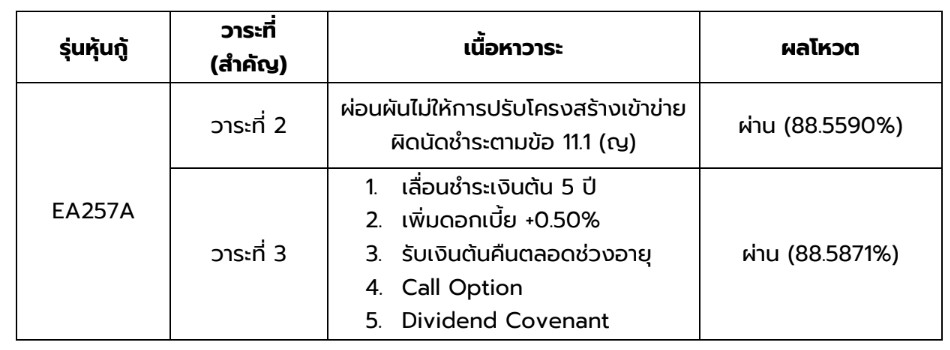 วันนี้ (18 ก.ค.68 ) มีการประชุมผู้ถือหุ้นกู้ บริษัท พลังงานบริสุทธิ์ (EA) รุ่น EA257A มีมติอนุมัติ 2 วาระสำคัญ ผ่อนผันไม่ให้การปรับโครงสร้างหนี้ เข้าข่ายการผิดนัดชำระ และการขยายเวลาไถ่ถอนหุ้นกู้ครบกำหนด 5 ปี