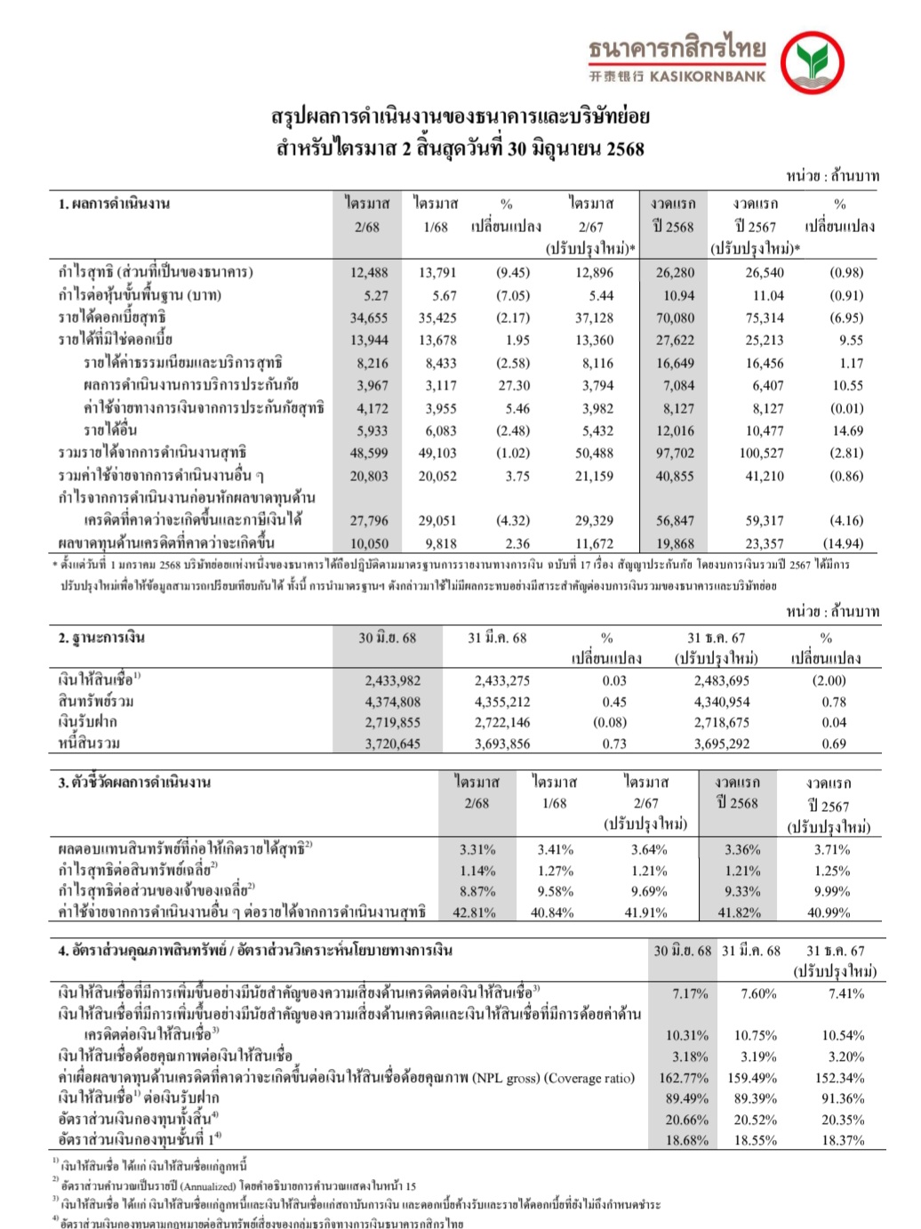 HoonSmart.com>>กสิกรไทย เผยกำไรสุทธิ ไตรมาส 2/68 อยู่ที่ 12,488 ล้านบาท หด 9.45% ผลจากการลดดอกเบี้ยกู้ช่วยลูกค้า ครึ่งปีแตะ 26,280 ล้านบาท ลดเพียง 0.98% ด้าน NIM อยู่ที่ 3.31%  , Coverage Ratio เพิ่มขึ้นแตะ 162.77% เพื่อรองรับ NPL 3.18% ด้าน Cost to Income 41.82% สะท้อนประสิทธิภาพการบริหารต้นทุนดี คาดครึ่งปีหลังเศรษฐกิจเสี่ยงไม่โต ส่งออกหดตัวลึก เดินหน้ายุทธศาสตร์ 3+1