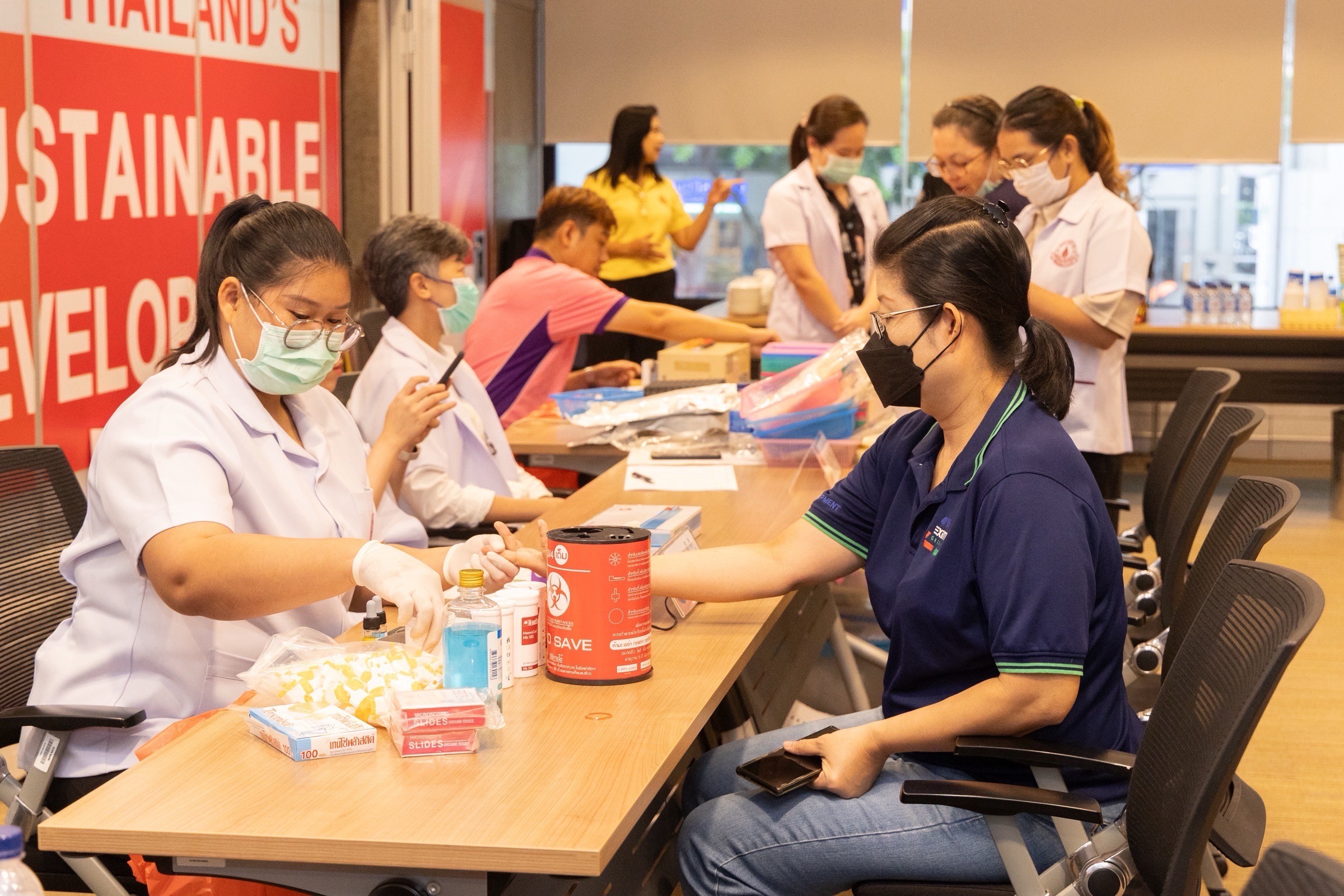 นายบัณฑิต สะเพียรชัย กรรมการ และรักษาการกรรมการผู้จัดการ ธนาคารเพื่อการส่งออกและนำเข้าแห่งประเทศไทย (EXIM BANK) นายสายชล จังสมยา ผู้อำนวยการเขตพญาไท พร้อมด้วยผู้บริหารและพนักงาน EXIM BANK ธนาคารพัฒนาวิสาหกิจขนาดกลางและขนาดย่อมแห่งประเทศไทย (SME D Bank) บริษัท แอดวานซ์ อินโฟร์ เซอร์วิส จำกัด (มหาชน) (AIS) บริษัท โนเบิล ดีเวลลอปเมนท์ จำกัด (มหาชน) และจิตอาสาในชุมชนเขตพญาไท เข้าร่วมกิจกรรม “ชุมชนคนอารีย์…บริจาคโลหิตต่อชีวิต ด้วยจิตอาสา” เฉลิมพระเกียรติพระบาทสมเด็จพระปรเมนทรรามาธิบดีศรีสินทรมหาวชิราลงกรณ พระวชิรเกล้าเจ้าอยู่หัว เนื่องในโอกาสมหามงคลเฉลิมพระชนมพรรษา 28 กรกฎาคม 2568 ภายใต้โครงการ CSR “EXIM เพื่อสุขภาพชุมชน” จัดโดย EXIM BANK ร่วมกับสำนักงานเขตพญาไท และพันธมิตรภาครัฐและภาคเอกชนในเขตพญาไท เพื่อร่วมสร้างพลังแห่งความดีและความยั่งยืนให้เกิดขึ้นในสังคม ณ EXIM BANK สำนักงานใหญ่ เมื่อวันที่ 22 กรกฎาคม 2568