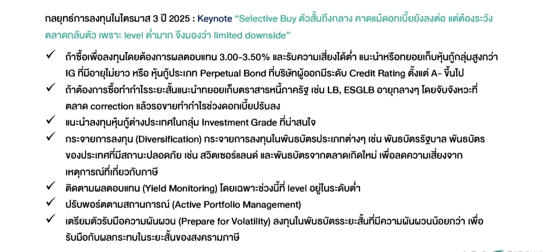 ทั้งนี้ แนะนำ ลงทุนแบบ Selective Buy มากขึ้น โดยเน้นตราสารที่มีอันดับความน่าเชื่อถือสูงกว่า BBB และอายุไม่เกิน 2 ปี