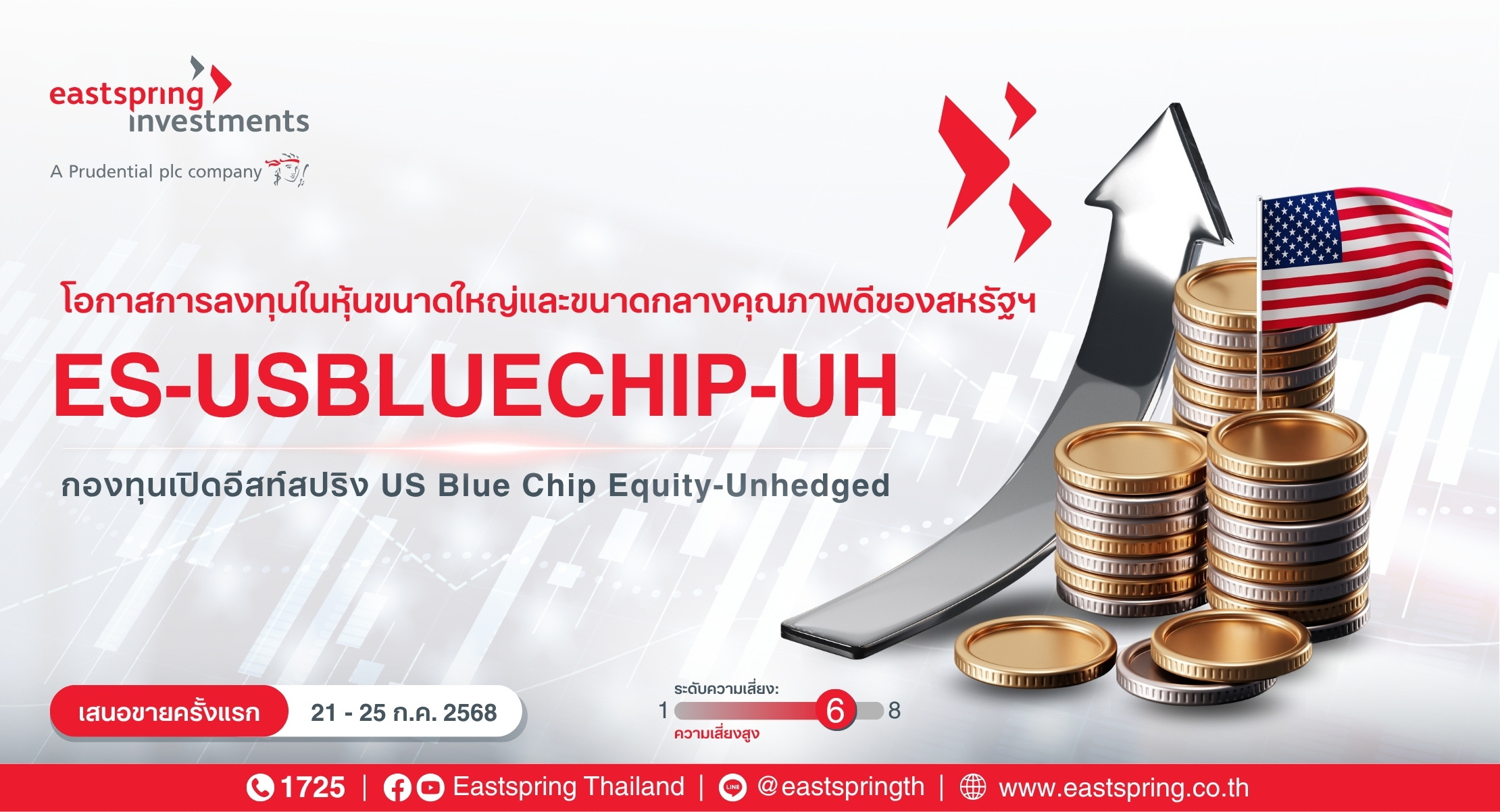นางสาวดารบุษป์ ปภาพจน์ กรรมการผู้จัดการ บริษัทหลักทรัพย์จัดการกองทุน (บลจ.) อีสท์สปริง (ประเทศไทย) จำกัด เปิดเผยว่า ตามที่บลจ.อีสท์สปริง ได้มีจัดตั้งกองทุนเปิดอีสท์สปริง US Blue Chip Equity (ES-USBLUECHIP) ซึ่งกองทุนหลักเน้นลงทุนในหุ้นขนาดใหญ่คุณภาพดีของสหรัฐอเมริกา ตั้งแต่ปี 2559 จนถึงปัจจุบัน ถือเป็นกองทุนที่มีผลการดำเนินงานที่สามารถสร้างโอกาสรับผลตอบแทนที่น่าพอใจในระยะยาว บลจ.อีสท์สปริง จึงได้ออกกองทุนเปิดอีสท์สปริง US Blue Chip Equity-Unhedged (ES-USBLUECHIP-UH) เพิ่มขึ้นอีก 1 กองทุน โดยไม่มีนโยบายป้องกันความเสี่ยงจากอัตราแลกเปลี่ยน ด้วยมูลค่าโครงการ 2,000 ล้านบาท และเปิดเสนอขายครั้งแรกตั้งแต่วันนี้ – 25 กรกฎาคม 2568 ด้วยมูลค่าเงินลงทุนขั้นต่ำเพียง 1 บาท