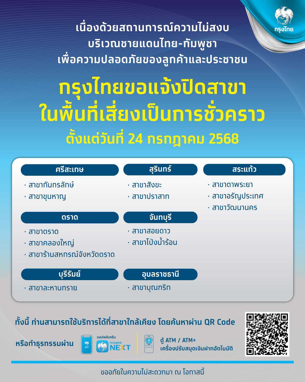 ธนาคารกรุงไทย (KTB) ขอแจ้งปิดบริการสาขาในพื้นที่เสี่ยงเป็นการชั่วคราว ตั้งแต่วันที่ 24กรกฎาคม 2568 เป็นต้นไป เนื่องจากสถานการณ์ความไม่สงบ บริเวณชายแดนไทย-กัมพูชา เพื่อความปลอดภัยของลูกค้า และ ประชาชน ประกอบด้วย 14 สาขา ดังนี้