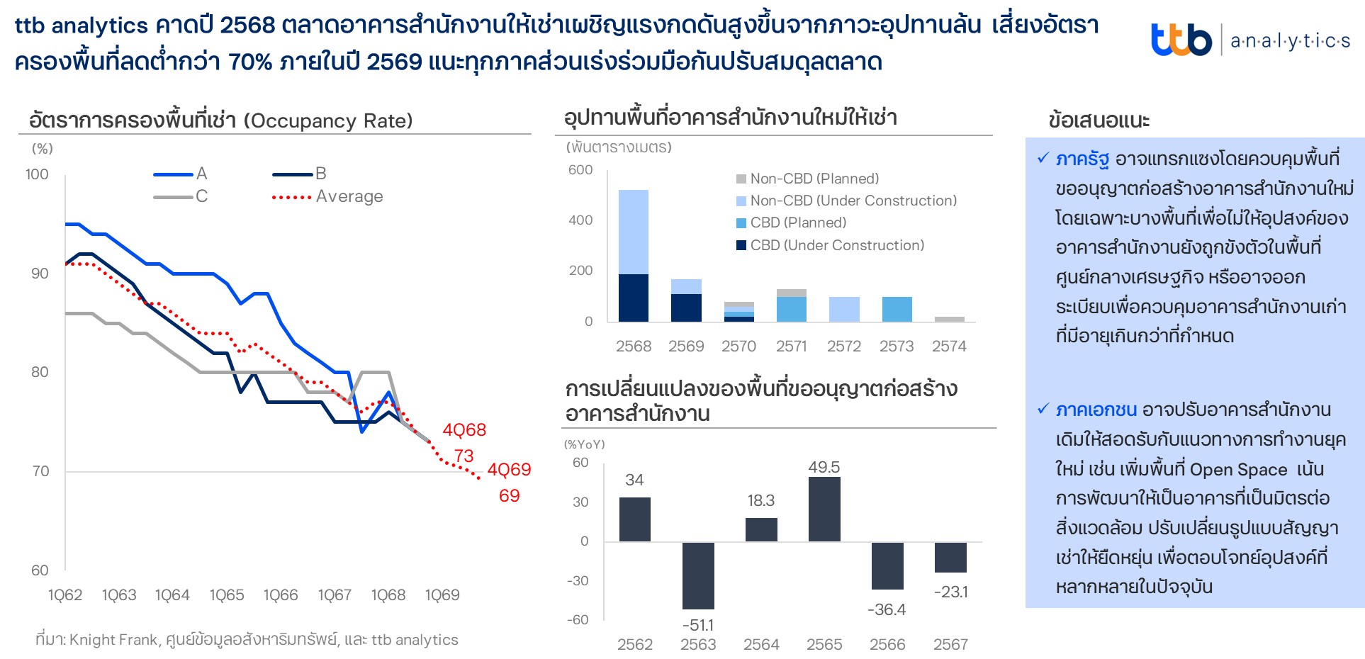 ศูนย์วิเคราะห์เศรษฐกิจ ทีทีบี หรือ ttb analytics คาดภาวะอุปทานล้นในตลาดอาคารสำนักงานให้เช่าปี 2568 จะมีมากขึ้น ทำให้อัตราครองพื้นที่ลดเหลือเพียง 73% พร้อมคาดสิ้นปี 2569 มีโอกาสลดลงต่ำกว่า 70% แนะภาครัฐคุมอุปทานใหม่ เปลี่ยนอุปทานเก่าให้เกิดประโยชน์มากขึ้น ในขณะที่ภาคเอกชนต้องเร่งรับมือสำหรับอุปสงค์ที่อาจเปลี่ยนไป บนความหวังที่หากเศรษฐกิจไทยเติบโต สถานการณ์อุปทานล้นอาจค่อย ๆ ทุเลาลง