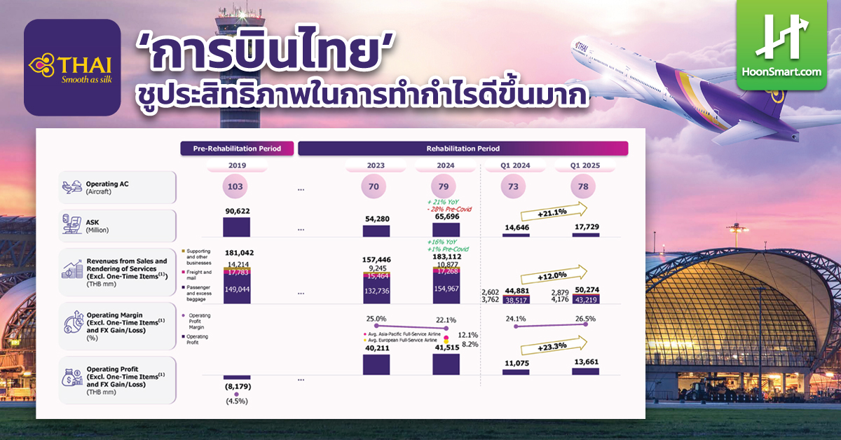 ส่วนไตรมาสที่ 1/ 2568 มีรายได้รวม (ไม่รวมรายการที่เกิดขึ้นครั้งเดียว) ทั้งสิ้น 51,625 ล้านบาท เพิ่มขึ้นจากช่วงเดียวกันของปีก่อน 12.3% กำไรจากการดำเนินงาน (ก่อนต้นทุนทางการเงินไม่รวมรายการที่เกิดขึ้นครั้งเดียว) 13,661 ล้านบาท อัตราการบรรทุกผู้โดยสาร (Cabin Factor) เท่ากับ 83.3% และ อัตราผลตอบแทนต่อผู้โดยสาร (Passenger Yield) เท่ากับ 2.91 ใกล้เคียงกับปีก่อน และความสำเร็จจากการแปลงหนี้และดอกเบี้ยตั้งพักของเจ้าหนี้เป็นทุนกว่า 53,453 ล้านบาท และเสนอขายหุ้นเพิ่มทุนให้แก่ผู้ถือหุ้นเดิมก่อนการฟื้นฟูกิจการและพนักงานของบริษัทฯกว่า 22,987 ล้านบาท ในปี 2567 ที่ผ่านมา