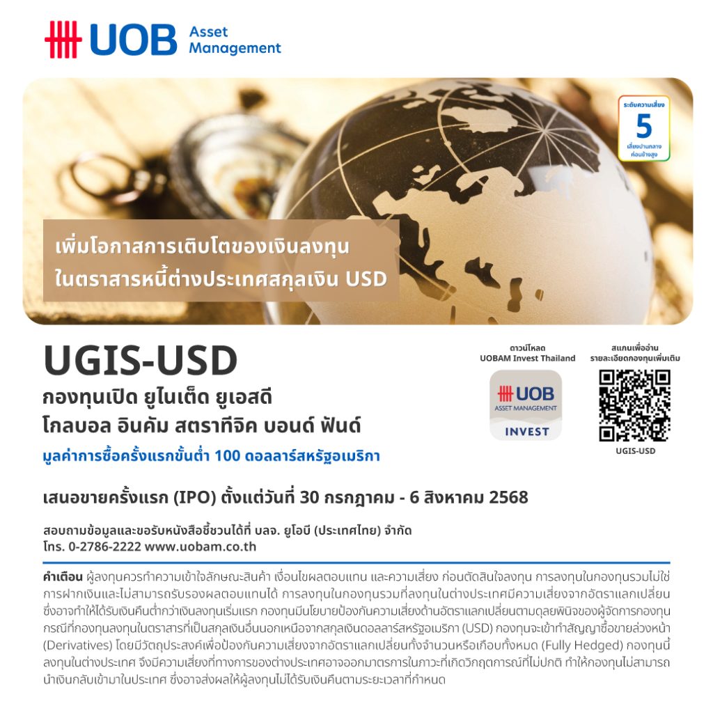 บริษัทหลักทรัพย์จัดการกองทุน (บลจ.) ยูโอบี (ประเทศไทย) จำกัด เสนอโอกาสการลงทุนใน กองทุนเปิด ยูไนเต็ด ยูเอสดี โกลบอล อินคัม สตราทีจิค บอนด์ ฟันด์ (UGIS-USD) กองทุนรวมตราสารหนี้ทั่วโลกที่ให้ผลตอบแทนในสกุลเงินดอลลาร์สหรัฐ (USD) โดยมีวัตถุประสงค์เพื่อนำเสนอทางเลือกให้แก่นักลงทุนที่ต้องการกระจายความเสี่ยงของพอร์ตการลงทุน พร้อมเพิ่มโอกาสรับผลตอบแทนในสกุลเงินดอลลาร์สหรัฐ เสนอขายครั้งแรกระหว่างวันที่ 30 กรกฎาคม – 6 สิงหาคม 2568