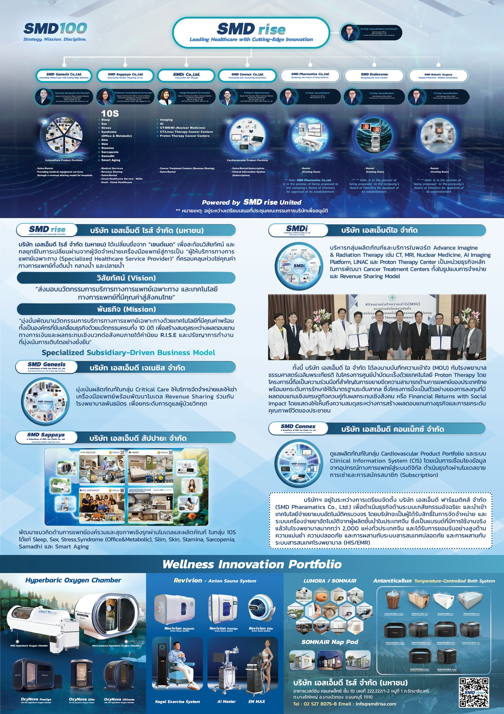 ดร.วิโรจน์ วสุศุทธิกุลกานต์ ประธานเจ้าหน้าที่บริหาร บริษัท เอสเอ็มดี ไรส์ (SMD100) เปิดเผยว่า เป้าหมายธุรกิจปี 2568 คาดเติบโต 50% จากปีก่อนหน้า คาดการณ์รายได้รวม (TOP Line) ไม่ต่ำกว่า 1,200 ล้านบาท และปี 2569 ตั้งเป้ารายได้รวม ไม่น้อยกว่า 2,400 ล้านบาท เติบโตทะลุ 100% จากฐานรายได้ที่คาดการณ์ของปีนี้ หรือ 300% ของฐานรายได้ปี 2567 สะท้อน ความเชื่อมั่นในระบบนิเวศธุรกิจที่ได้รับการปรับโครงสร้างและทรานส์ฟอร์มสำเร็จ