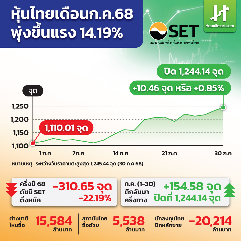 วันที่ 30 ก.ค.68 ตลาดหุ้นวิ่งแรงต่อ ดัชนี SET ปิดที่ระดับ 1,244.14 จุด เพิ่มขึ้น 10.46 จุด หรือ +0.85% มูลค่าซื้อขาย 54,670.81 ล้านบาท ฝีมือสถาบันไทยซื้อสุทธิ 2,161.25 ล้านบาท ส่วนต่างชาติขาย 264.86 ล้านบาท บัญชีหลักทรัพย์ขาย 629.88 บาท และนักลงทุนไทยทิ้งต่อ 1,266.51 ล้านบาท