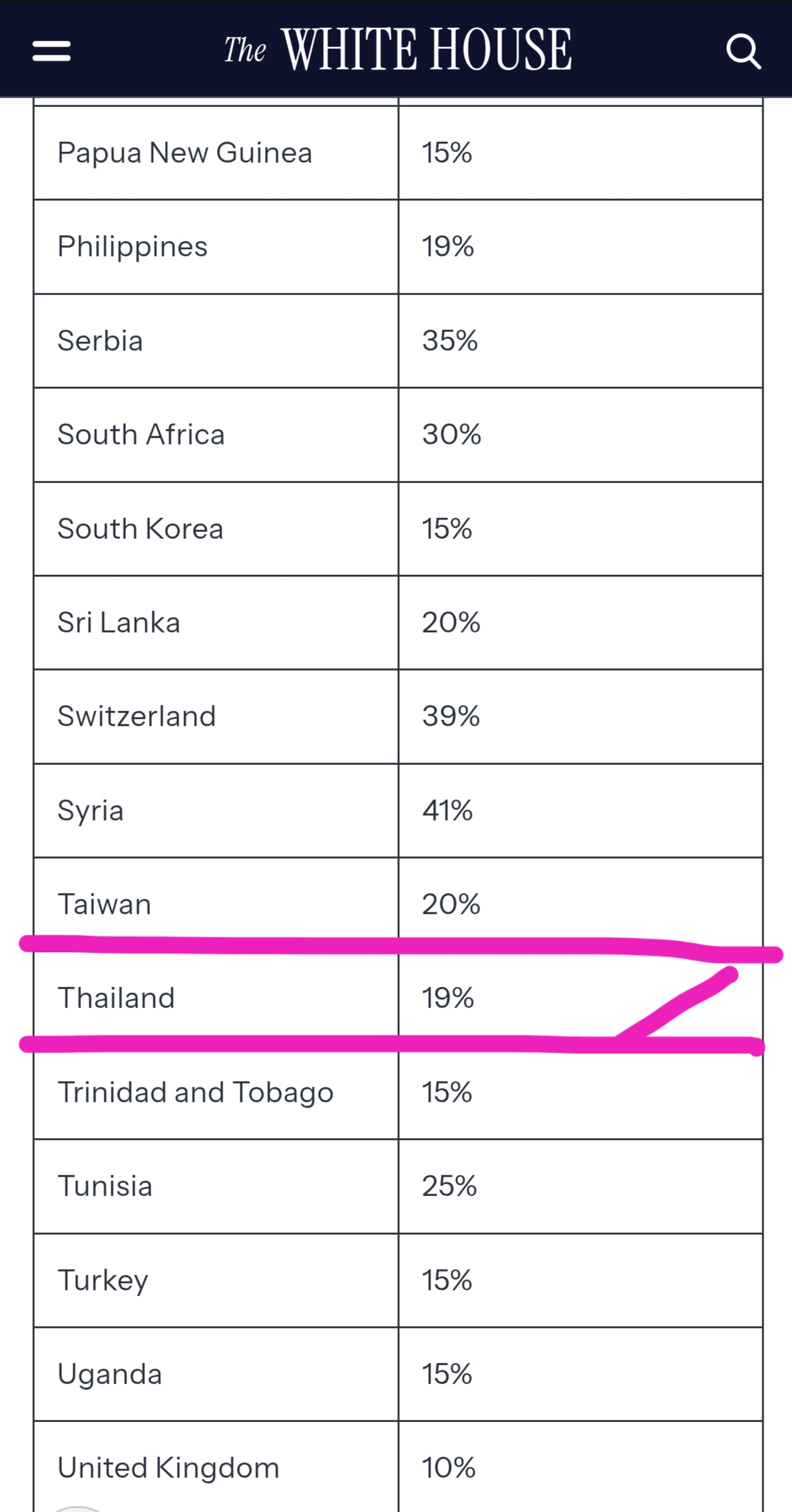 ไทยอยู่ในกลุ่มภาษีสูงระดับกลางตามประกาศของทำเนียบขาว ประเทศไทยถูกจัดอยู่ในกลุ่มที่มีอัตราภาษี 19% เท่ากับ 5 ประเทศในภูมิภาค