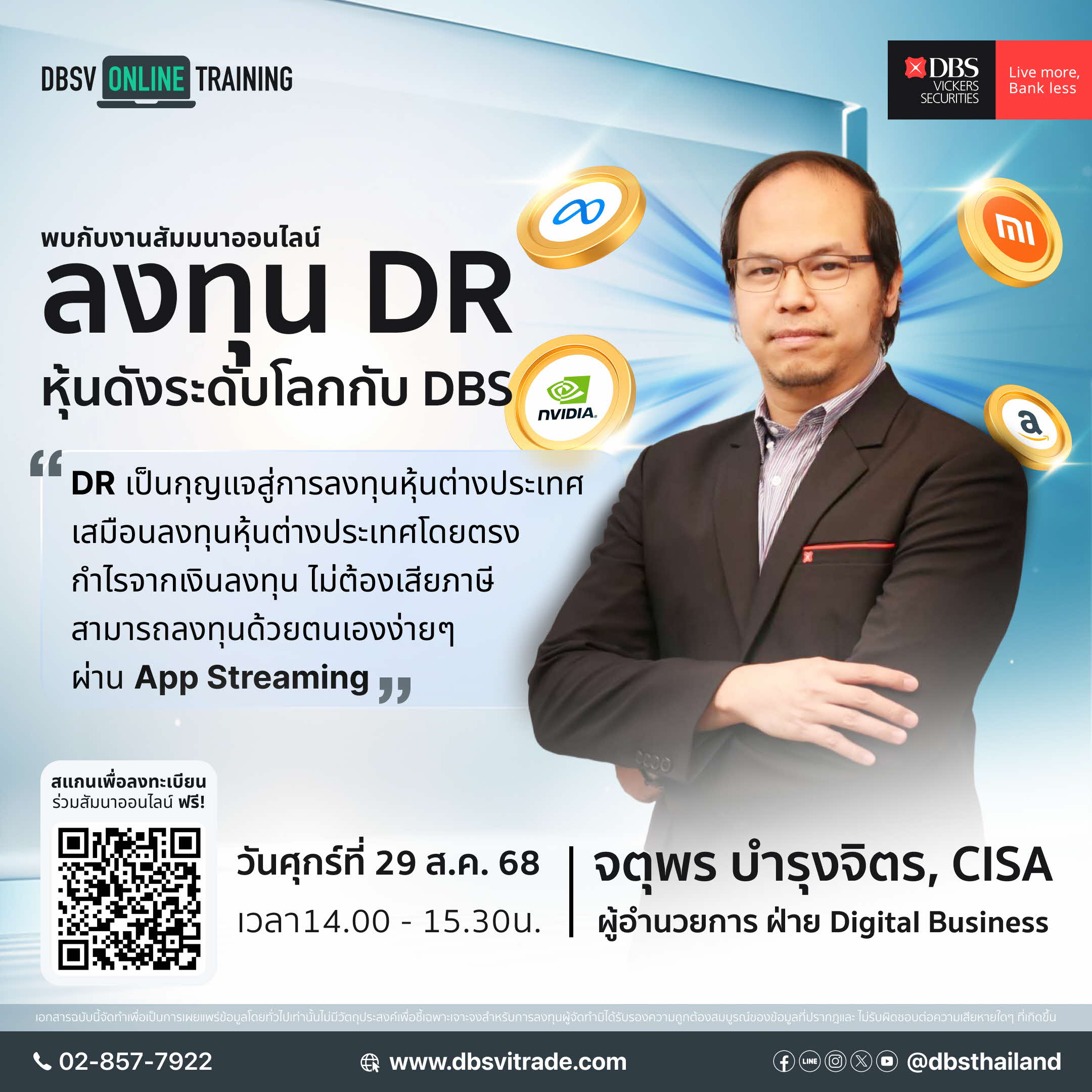 บริษัทหลักทรัพย์ ดีบีเอส วิคเคอร์ส (ประเทศไทย) เตรียมจัดสัมมนาออนไลน์ หัวข้อ ““ลงทุน DR หุ้นดังระดับโลกกับ DBS” วันศุกร์ที่ 29 สิงหาคม 2568 เวลา 14.00 – 15.30 น.ช่องทางอบรม: ผ่านทาง MS Team วิทยากรโดย จตุพร บำรุงจิตร ผู้อำนวยการ ฝ่าย Digital Business สนใจลงทะเบียนคลิ https://forms.gle/u1sgsBQmWo1mqKxj9 หรือสอบถามเพิ่มเติม 02-857-7922