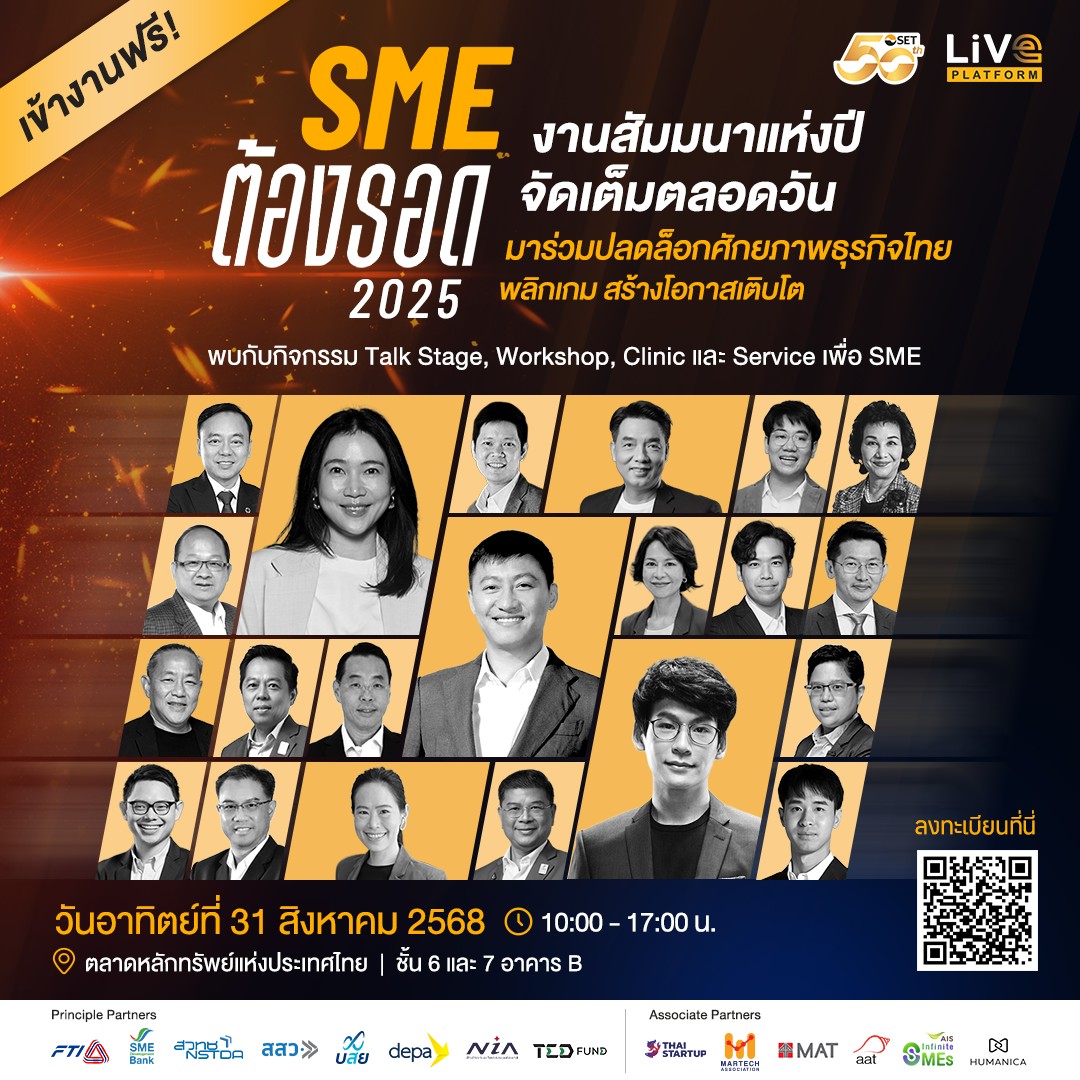 LiVE Platform โดยบริษัท ไลฟ์ฟินคอร์ป จำกัด ภายใต้กลุ่มตลาดหลักทรัพย์แห่งประเทศไทย ชวนผู้ประกอบการ SMEs และ Startups รวมถึงผู้บริหารองค์กร และทีมงานสายพัฒนาองค์กร ร่วมงานสัมมนา SME แห่งปี SME ต้องรอด 2025” มาปลดล็อคศักยภาพธุรกิจไทย พลิกเกม ฝ่าวิกฤตเศรษฐกิจไปด้วยกัน พบกับการรวมตัวของผู้เชี่ยวชาญแถวหน้าของประเทศที่จะมาเปิดทุกมุมมอง พร้อมเสิร์ฟกลยุทธ์ที่ “ใช้ได้จริง” ให้คุณเข้าใจทุกเทรนด์ ทั้งเศรษฐกิจ เทคโนโลยี การเงิน การเข้าถึงแหล่งทุน และการบริหารคน จัดเต็มตลอดวัน ใน 4 Stages