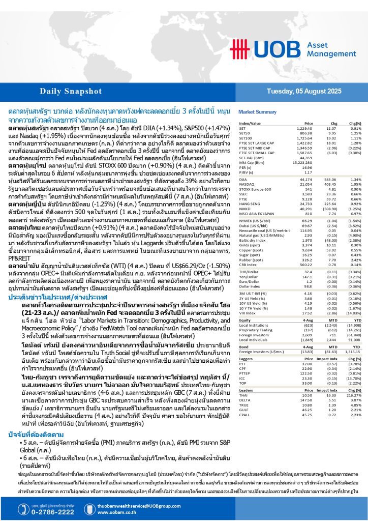UOBAM Daily Snapshot : ตลาดหุ้นสหรัฐฯบวกต่อ หลังนักลงทุนคาดหวังเฟดจะลดดอกเบี้ย 3 ครั้งในปีนี้ 05/08/2025 09:3505/08/2025 09:36009Breaking News, Fund Manager HoonSmart.com>> UOBAM Daily Snapshot : ตลาดหุ้นสหรัฐฯบวกต่อ หลังนักลงทุนคาดหวังเฟดจะลดดอกเบี้ย 3 ครั้งในปีนี้ หนุนจากความกังวลตัวเลขจ้างงานที่ออกมาอ่อนแอ ———————————————————————————————————————————————————– ———————————————————————————————————————————————————– Facebook iconFacebookTwitter iconTwitterLINE iconLine