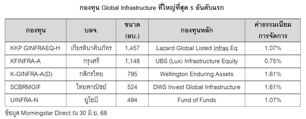 ภาพรวมของกองทุน Global Infrastructure ในไทย ปัจจุบันมีมูลค่าทรัพย์สินสุทธิรวมราวๆ 7 พันล้านบาท ขนาดค่อนข้างเล็กเมื่อเทียบกับกองทุนกลุ่มอุตสาหกรรมอื่นๆ เช่น กองทุนหุ้นเทคโนโลยี, กองทุนหุ้นอสังหาริมทรัพย์ หรือ กองทุนหุ้น Health care ที่ล้วนมีขนาดทรัพย์สินเกินกว่า 3 หมื่นล้านทั้งหมด โดยส่วนหนึ่งอาจมีสาเหตุมาจากบางกองทุนที่มีกลยุทธ์ยืดหยุ่นทั้งการลงทุนในอสังหาริมทรัพย์และโครงสร้างพื้นฐานเข้าด้วยกัน ทำให้ถูกจัดกลุ่มอยู่ในกองทุนประเภทอื่นๆ