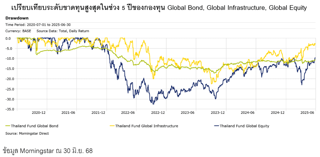นอกจากนี้ หากเทียบกับจุดขาดทุนสูงสุด (Maximum drawdown) ในช่วง 5 ปีที่ผ่านมา พบว่า ในช่วงปี 2565 ซึ่งเป็นจุดเริ่มต้นวัฏจักรดอกเบี้ยขาขึ้นนั้น ทั้งกองทุน Global Bond, Global Equity และ Global Infrastructure ล้วนได้รับปัจจัยกดดัน แต่กองทุน Global Equity มีการปรับตัวลดลงมากที่สุด ในขณะที่กองทุน Global Infrastructure ปรับตัวลดลงต่ำกว่า ทำให้สามารถฟื้นตัวกลับได้เร็วและมีระดับขาดทุนน้อยที่สุดเมื่อเทียบกับช่วงเวลาเดียวกัน