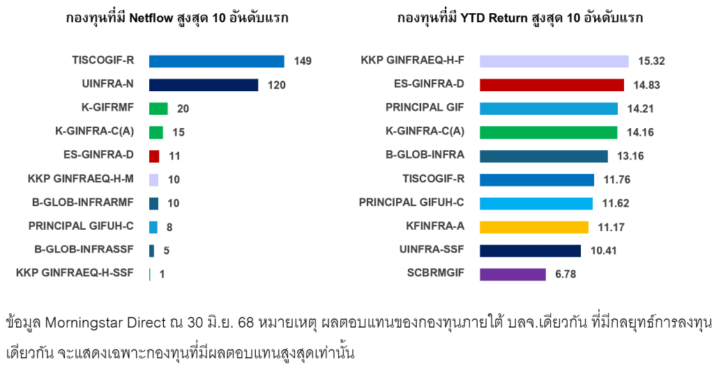 ทั้งนี้ ถึงแม้ว่าเงินไหลเข้าโดยรวมของกองทุนกลุ่ม Global Infrastructure จะติดลบ แต่ว่าหากพิจารณารายกองทุน จะพบว่ากองทุน 10 อันดับแรกที่มีเงินไหลเข้าสูงสุดยังคงมีเงินไหลเข้าเป็นบวกทั้งหมด