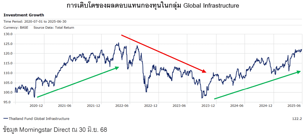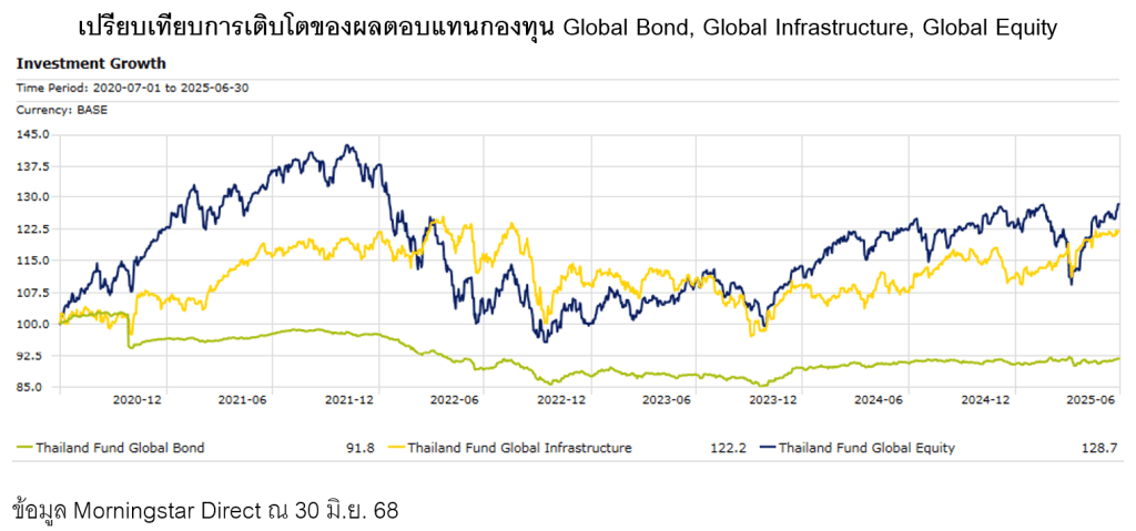 เมื่อเทียบกับสินทรัพย์หลักอย่างกองทุนในกลุ่ม Global Bond (เส้นสีเขียว) และ Global Equity (เส้นสีน้ำเงิน) พบว่าในช่วง 5 ปีที่ผ่านมา กองทุน Global Infrastructure (เส้นสีเหลือง) มีการเติบโตของผลตอบแทนที่มีความผันผวนค่อนข้างต่ำกว่ากองทุน Global Equity แต่ในระยะยาวยังสามารถสร้างการเติบโตได้ใกล้เคียงกัน