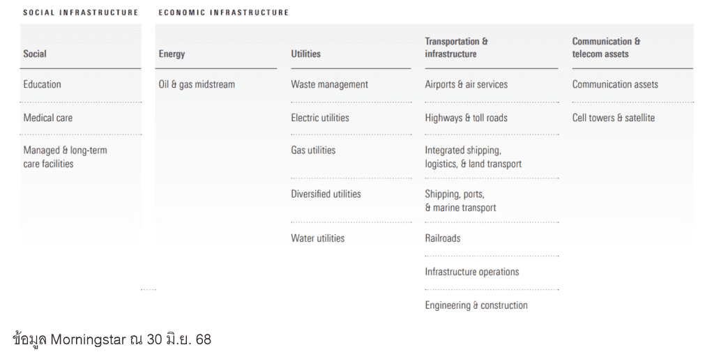 Global Infrastructure เป็นธีมการลงทุนที่น่าสนใจ เนื่องจาก Infrastructure หรือ โครงสร้างพื้นฐาน นั้นเปรียบเสมือนรากฐานการเติบโตทางเศรษฐกิจ เพราะเกี่ยวข้องกับสาธารณูปโภคที่สำคัญในด้านต่างๆ ไม่ว่าจะเป็นพลังงาน คมนาคม ดิจิทัล โดยหากอ้างอิงจาก Morningstar Global Equity Infrastructure Index ธุรกิจในกลุ่มโครงสร้างพื้นฐานมีการกระจายตัวอยู่ถึง 18 อุตสาหกรรม ภายใต้ 5 หมวดธุรกิจหลัก