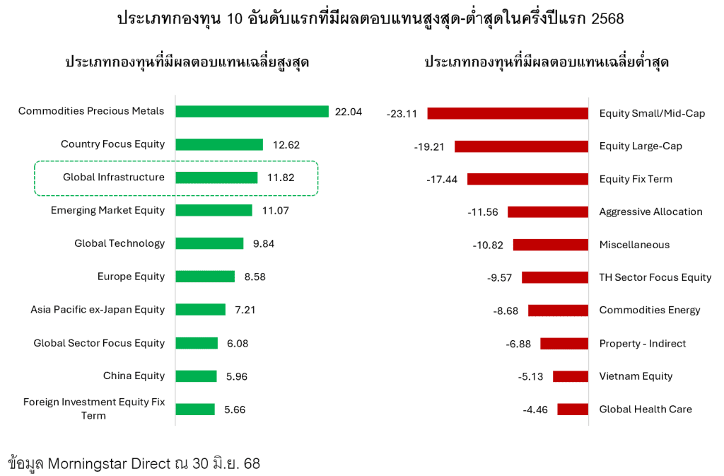 บริษัท มอร์นิ่งสตาร์ รีเสิร์ช (ประเทศไทย) เปิดเผยว่า ในช่วงครึ่งปีแรกของปี 2568 กลุ่มกองทุน Global Infrastructure ทำผลงานได้อย่างน่าสนใจ สร้างผลตอบแทนเฉลี่ยได้สูงถึง 11.82% รั้งตำแหน่งประเภทกองทุนอันดับ 3 ของกองทุนรวมในไทยที่สามารถสร้างผลตอบแทนได้สูงที่สุด โดยเป็นรองเพียงกองทุนกลุ่ม Commodities Precious Metals และ Country Focus Equity