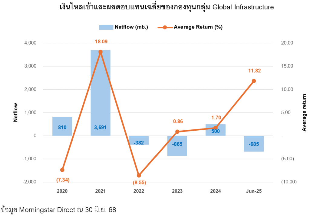 แม้ว่าในปีนี้กองทุนในกลุ่ม Global Infrastructure จะสามารถสร้างผลตอบแทนได้สูงถึง 11.8% แต่เม็ดเงินของนักลงทุนในกองทุนกลุ่มนี้ยังคงอยู่ในระดับติดลบกว่า 680 ล้านบาท และมีเม็ดเงินลงทุนที่ค่อนข้างเบาบางตลอดช่วงที่ผ่านมา โดยในปี 2564 เป็นปีที่กองทุนกลุ่ม Global Infrastructure มีเงินไหลเข้ามากที่สุดในช่วง 5 ปีย้อนหลัง ซึ่งมีเงินไหลเข้ากว่า 3,600 ล้านบาท และเป็นปีที่กองทุนกลุ่มนี้สามารถสร้างผลตอบแทนเฉลี่ยได้สูงสุดถึง 18.1% แต่หลังจากนั้นทั้งเงินไหลเข้าและผลตอบแทนก็ปรับตัวลดลง จนอาจทำให้ไม่เป็นที่สนใจของนักลงทุนเท่าที่ควร