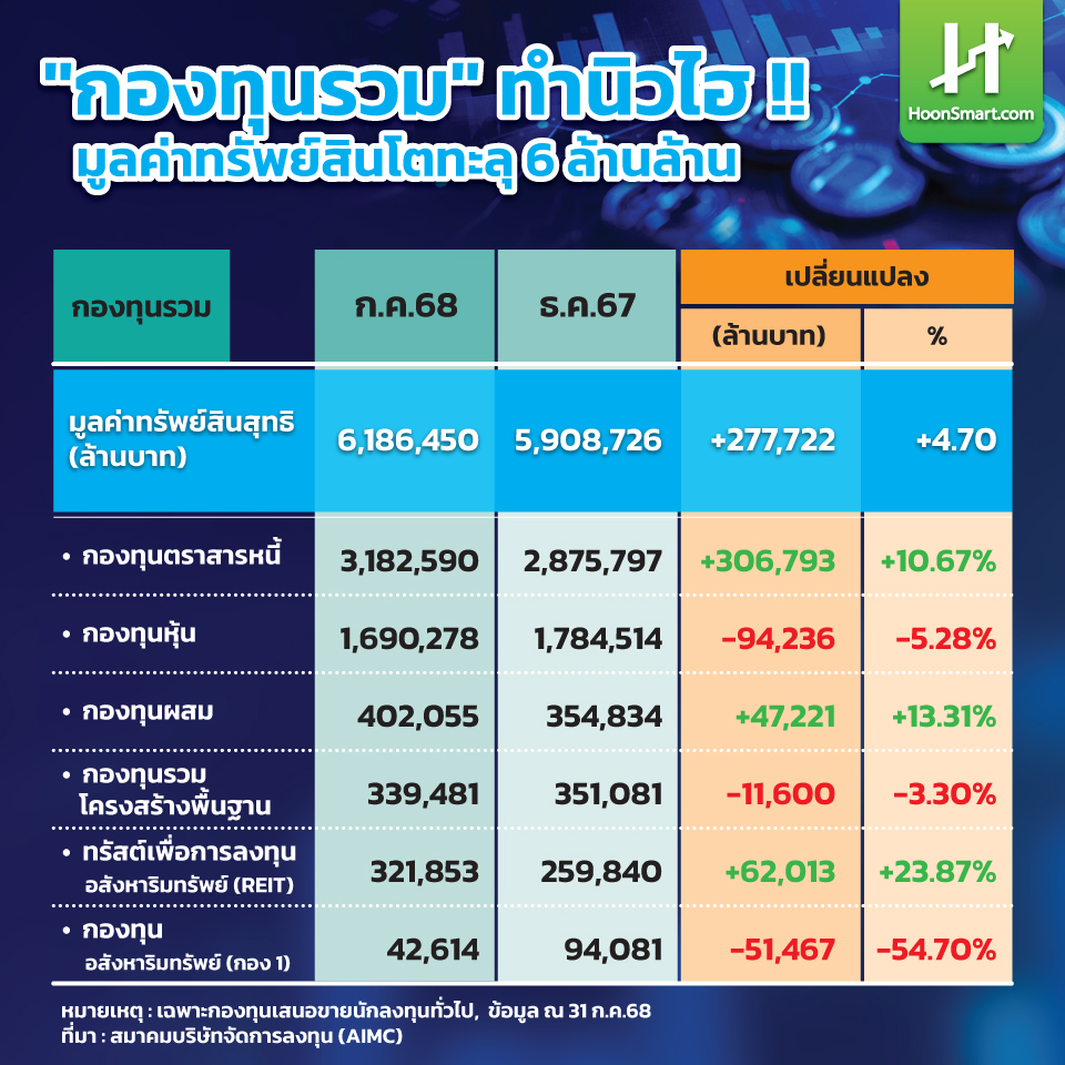 HoonSmart.com>> “กองทุนรวม” 7 เดือนแรกปี 68 มูลค่าเติบโตทะลุ 6 ล้านล้านบาท ทำนิวไฮ เพิ่มขึ้น 4.7% จากสิ้นปีก่อน เงินลงทุน “ตราสารหนี้” โตต่อเนื่องท่ามกลงภาวะตลาดผันผวน มูลค่าแตะ 3.18 ล้านล้านบาท ด้าน “กองทุนผสม” ได้รับความนิยมสูงขึ้น ส่วนกองทุน LTF มูลค่าเหลือ 1.08 แสนล้านบาท วูบ 49.40% จากแรงเทขายและโอนย้ายเข้า ThaiESGX ฟาก “บลจ.กสิกรไทย” (KAsset) เติบโตโดดเด่นในอุตสาหกรรม มูลค่าเพิ่มขึ้น 1.29 แสนล้านบาท โตเฉียด 10%