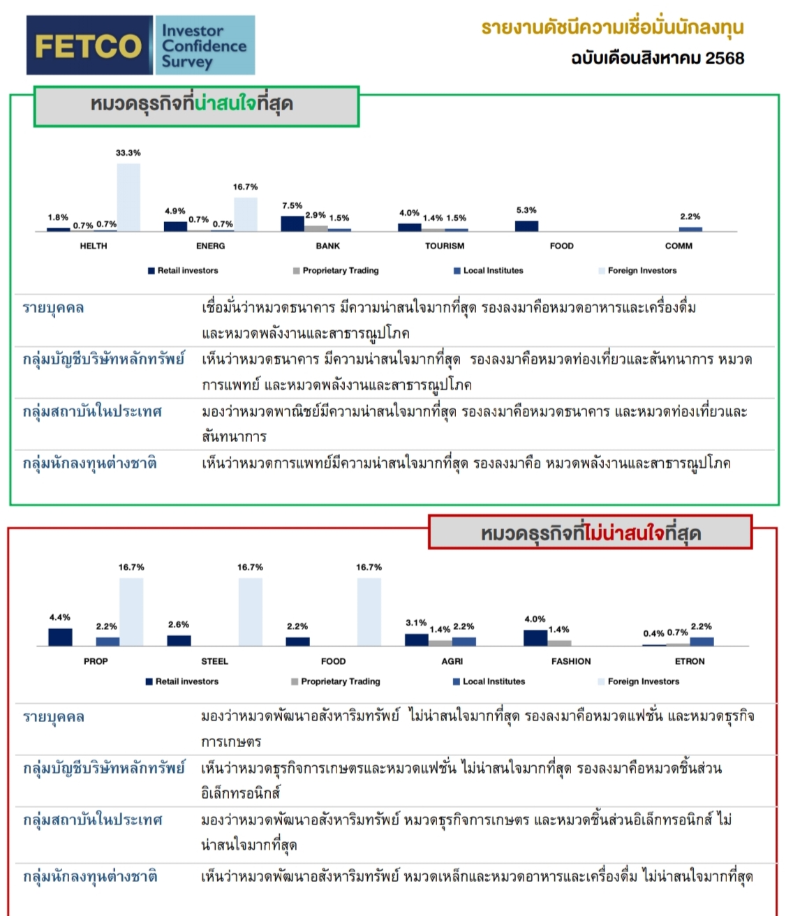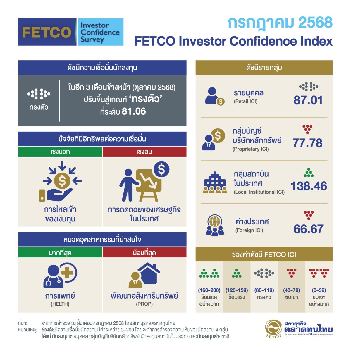 ดัชนีความเชื่อมั่นนักลงทุน (FETCO Investor Confidence Index) สำรวจในเดือนกรกฎาคม 2568 ได้ผลสำรวจโดยสรุป ดังนี้