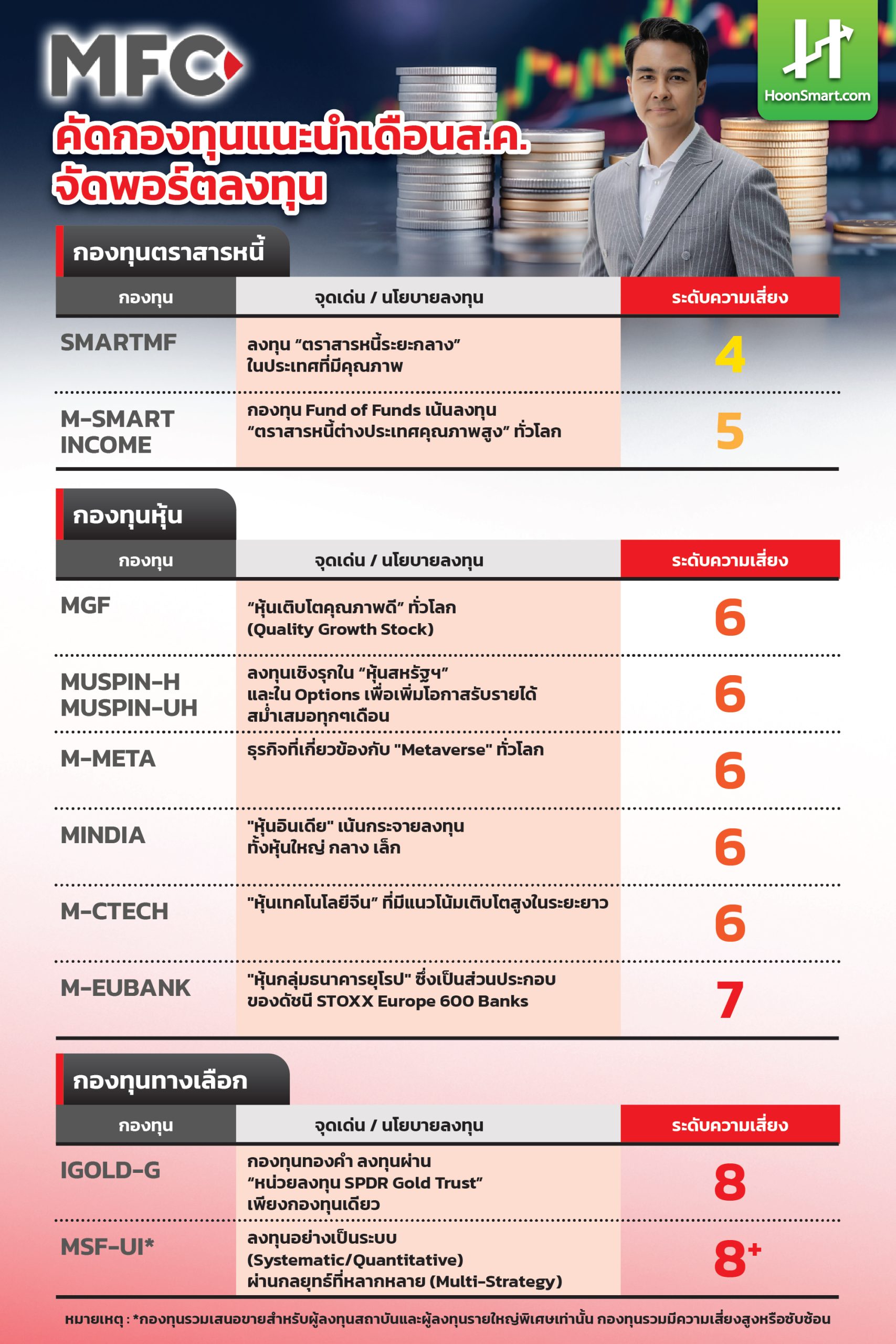 อย่างไรก็ตามหากนักลงทุนไม่อยากจัดพอร์ตเองหรือจับจังหวะตลาดด้วยตัวเอง แนะนำกองทุน MGALL ที่มีนโยบายการลงทุนสอดรับกับมุมมองการลงทุนของ MFC ที่สามารถรับมือกับสภาวะตลาดผันผวน เนื่องจากกระจายการลงทุนในหลายสินทรัพย์ทั่วโลก อาทิ ตราสารหนี้ หุ้น ทองคำ สินค้าโภคภัณฑ์และมีความยืดหยุ่นในการปรับพอร์ตลงทุน ปัจจุบันลงทุนในตราสารหนี้ประมาณ 70% และหุ้น 30%