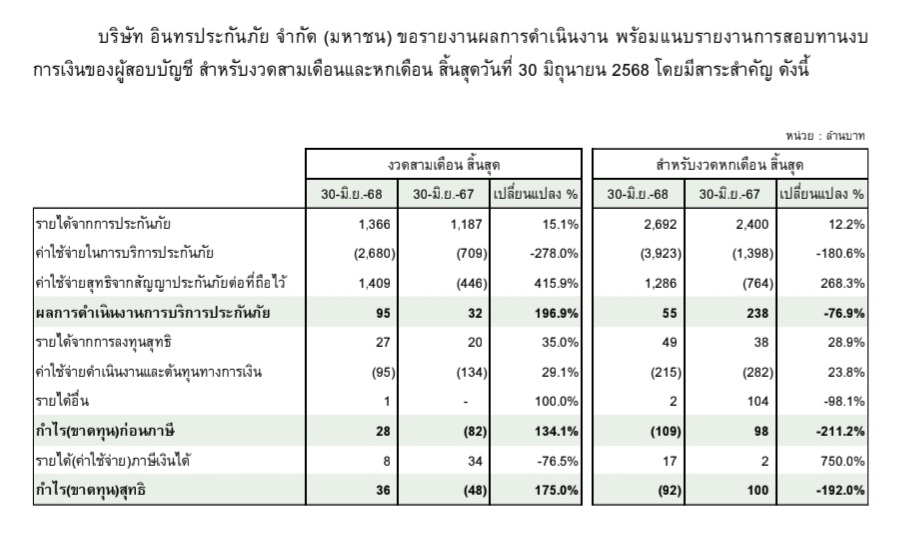 บริษัทอิทรประกันภัย (INSURE) แจ้งผลการดำเนินงานไตรมาส 2/2568 มีกำไรสุทธิจำนวน 36 ล้านบาท (กำไร 2.96 บาทต่อหุ้น) เพิ่มขึ้น 175% เทียบกับไตรมาสเดียวกันของปีก่อน ซึ่งมีขาดทุนสุทธิ 48 ล้านบาท (ขาดทุน 4.72 บาทต่อหุ้น)