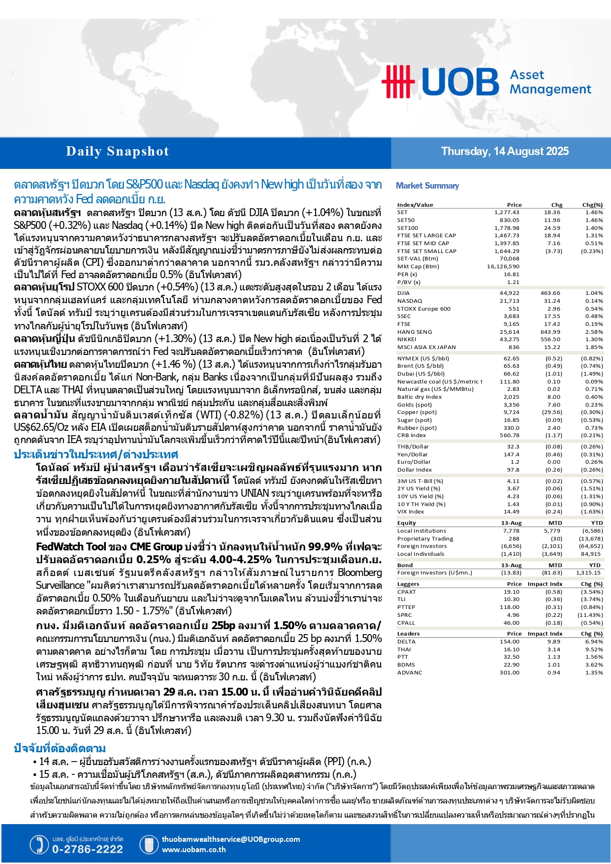 HoonSmart.com>> UOBAM Daily Snapshot : ตลาดสหรัฐฯ ปิดบวก โดย S&P500 , Nasdaq ยังคงทำ New high เป็นวันที่สอง จากความคาดหวัง Fed ลดดอกเบี้ย ก.ย. การเงินเอื้อต่อการปรับตัวของภาคธุรกิจและช่วยบรรเทาภาระของกลุ่มเปราะบาง