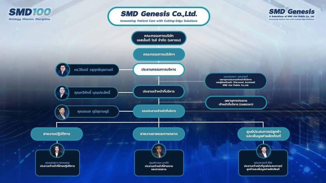 ดร.วิโรจน์ วสุศุทธิกุลกานต์ ประธานเจ้าหน้าที่บริหาร บริษัท เอสเอ็มดี ไรส์ (SMD100) เปิดเผยว่า คณะกรรมการบริษัท มีมติเมื่อ 14 ส.ค. อนุมัติโครงสร้างองค์กรใหม่ , แต่งตั้งผู้บริหารในตำแหน่งสำคัญของบริษัทและบริษัทย่อย พร้อมทั้งอนุมัติการจัดตั้งบริษัทย่อยเพิ่มเติมจำนวน 6 บริษัท เพื่อขยายธุรกิจและเพิ่มความแข็งแกร่งให้กับระบบนิเวศด้านนวัตกรรมสุขภาพของบริษัท