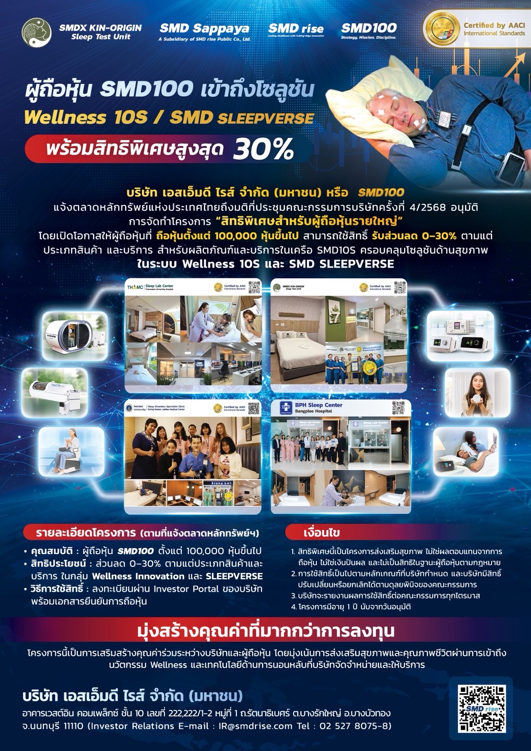 รายละเอียดโครงการพิเศษสำหรับผู้ถือหุ้น (ตามที่แจ้งตลาดหลักทรัพย์) ผู้ถือหุ้น SMD100 ตั้งแต่ 100,000 หุ้นขึ้นไป รับสิทธิประโยชน์: ส่วนลด 0–30% ตามแต่ประเภทสินค้าและบริการ ในกลุ่ม Wellness Innovation และ SLEEPVERSE และวิธีการใช้สิทธิ์: ลงทะเบียนผ่าน Investor Portal ของบริษัท พร้อมเอกสารยืนยันการถือหุ้น