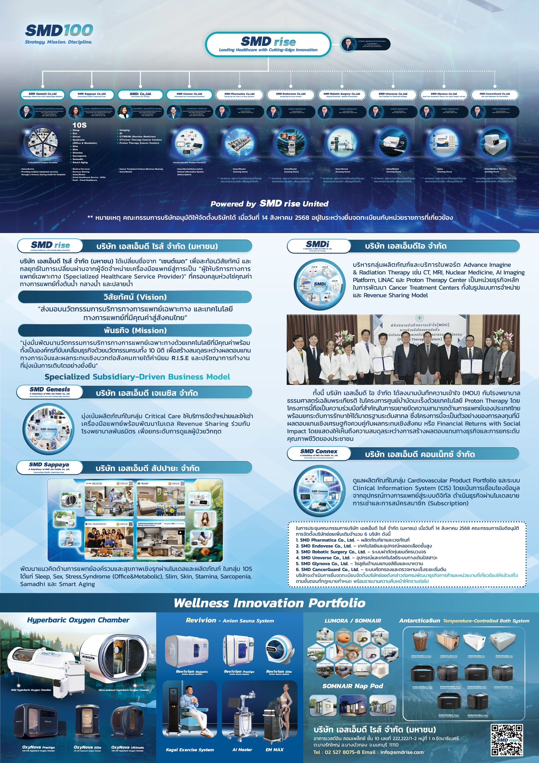การปรับโครงสร้างและการจัดตั้งบริษัทย่อยดังกล่าว เป็นส่วนหนึ่งของแผนยุทธศาสตร์ระยะยาวของบริษัท เพื่อขยายพอร์ตโฟลิโอธุรกิจครอบคลุมตั้งแต่ Critical Care, Cardiovascular, Oncology, Wellness & Longevity และเทคโนโลยีสุขภาพยุคใหม่ ภายใต้โมเดล SMD rise United โดยคาดว่าจะช่วยเสริมรายได้และความสามารถในการแข่งขันของบริษัทในตลาดทั้งในและต่างประเทศอย่างมีนัยสำคัญ