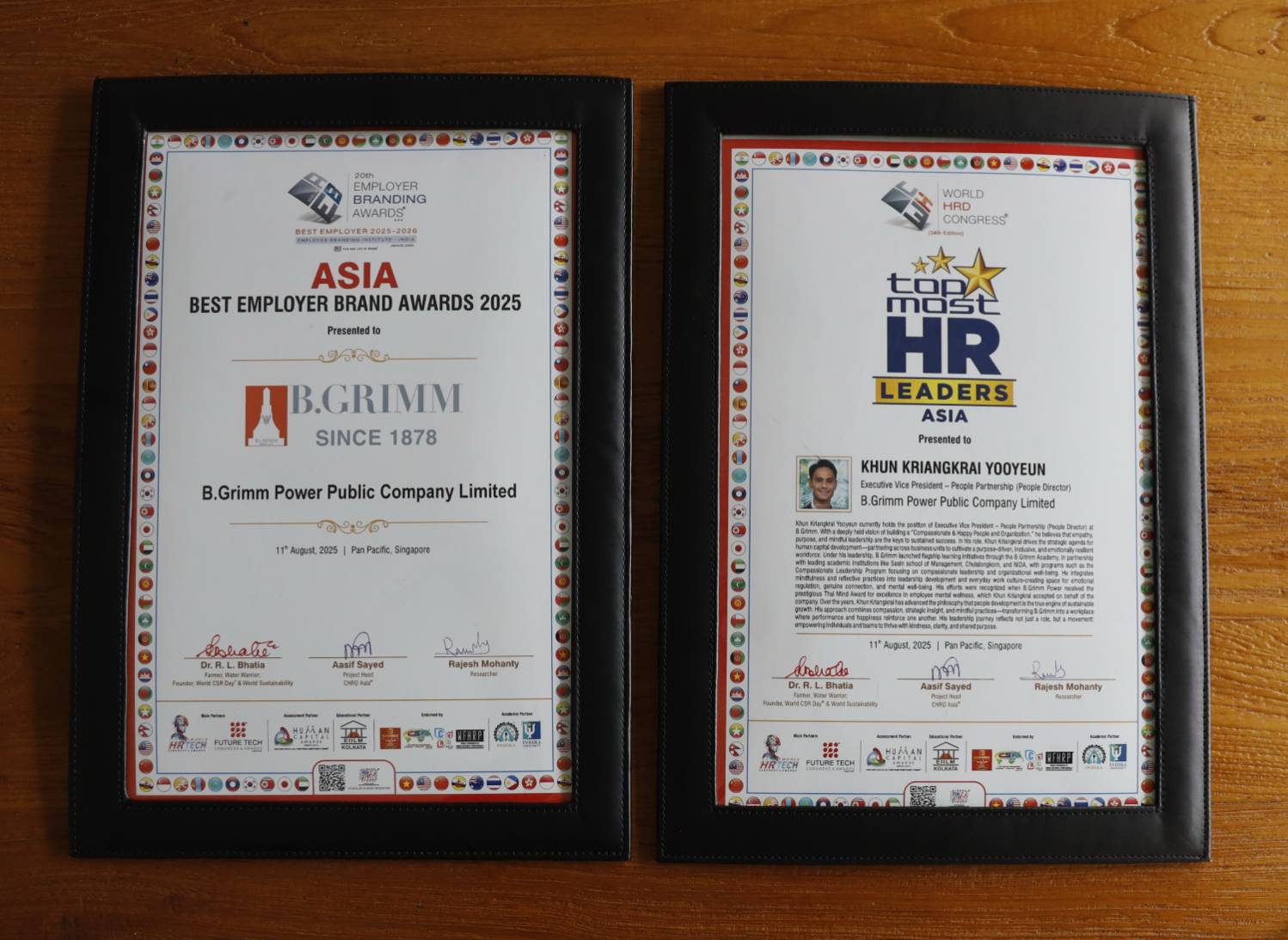 บริษัท บี.กริม เพาเวอร์  (BGRIM)  สร้างชื่อเสียงในระดับนานาชาติอีกครั้ง คว้ารางวัลอันทรงเกียรติ “Asia Best Employer Branding 2025” และ “Asia Top Most HR Leader” จากการพิจารณาและมอบรางวัลโดยกรรมการผู้ทรงคุณวุฒิจากสถาบัน World HRD Congress ณ ประเทศสิงคโปร์ ซึ่งเป็นงานประชุมด้านทรัพยากรบุคคลจากองค์กรชั้นนำและผู้นำจากหลากหลายประเทศ โดย คุณเกรียงไกร อยู่ยืน รองกรรมการผู้จัดการใหญ่สายงานทรัพยากรบุคคล เป็นตัวแทนเข้ารับมอบรางวัล ดังกล่าว