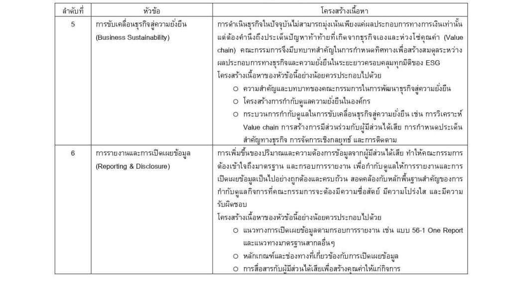 ก.ล.ต. และตลาดหลักทรัพย์ฯ ได้กำหนดมาตรฐานองค์ความรู้สำคัญเพื่อเป็นรากฐานการทำหน้าที่ของกรรมการอย่างมืออาชีพ ได้แก่ 1) บทบาทและการปฏิบัติหน้าที่ของคณะกรรมการอย่างมีประสิทธิผล 2) ความรับผิดชอบของคณะกรรมการตามกฎหมายที่เกี่ยวข้อง 3) ความรับผิดชอบของคณะกรรมการที่เกี่ยวข้องกับบัญชีและการเงิน 4) การกำกับดูแลความเสี่ยงเชิงกลยุทธ์ขององค์กร 5) การขับเคลื่อนธุรกิจสู่ความยั่งยืน และ 6) การรายงานและการเปิดเผยข้อมูล