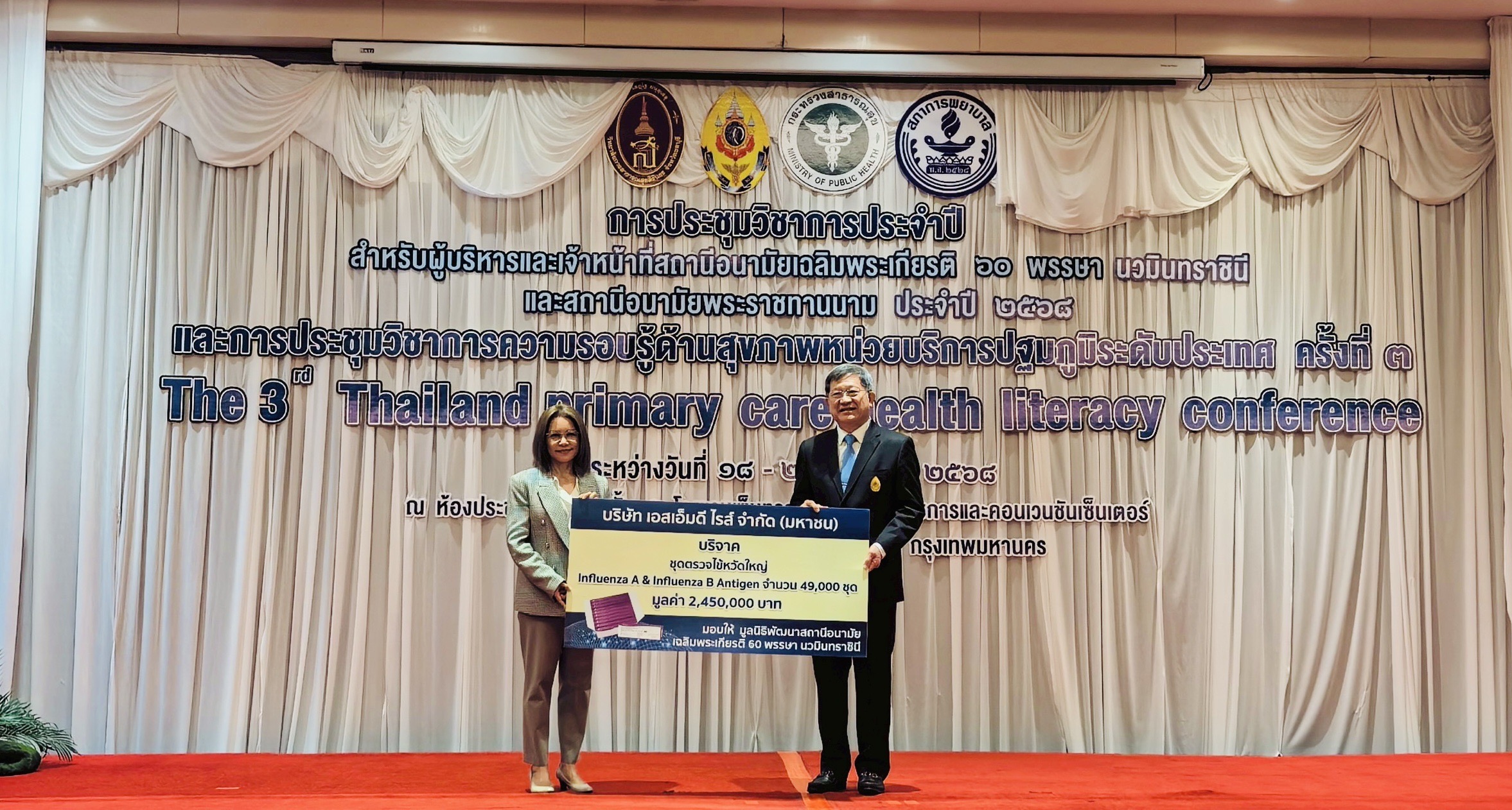 ดร.รมณ วสุศุทธิกุลกานต์ รองประธานเจ้าหน้าที่บริหาร บริษัท เอสเอ็มดี ไรส์ (SMD100) เป็นตัวแทนบริษัท มอบการสนับสนุนด้านการแพทย์และสาธารณสุข บริจาคชุดตรวจไข้หวัดใหญ่ Influenza A & B Antigen จำนวน 49,000 ชุด มูลค่ารวมกว่า 2,450,000 บาท ได้รับเกียรติจาก นายแพทย์โสภณ เมฆธน ประธานมูลนิธิพัฒนาสถาบันอายุรเวทสมเด็จพระศรีนครินทร์ 60 พรรษา บรมราชชนนี เป็นผู้รับมอบ วัตถุประสงค์เพื่อใช้ประโยชน์ทางการแพทย์และสาธารณสุข ทั้งในด้าน การป้องกันโรคไข้หวัดใหญ่ และ การดูแลสุขภาพประชาชน เมื่อเร็ว ๆ นี้