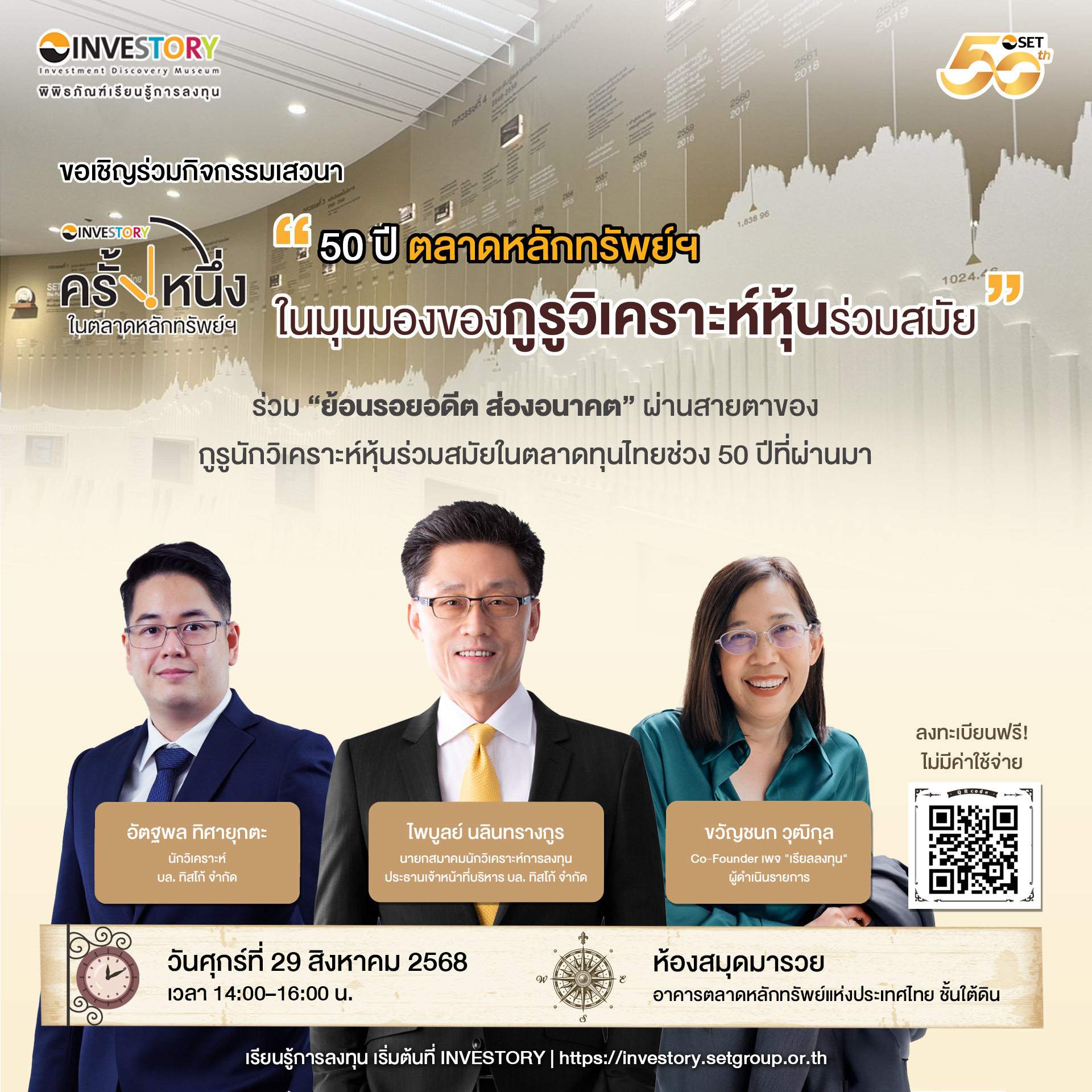 ร่วมค้นหาว่าอะไรคือ “บทเรียนสำคัญ” และ “โอกาสในวันข้างหน้า” ที่นักลงทุนไม่ควรพลาด พบกันวันศุกร์ที่ 29 สิงหาคม 2568 เวลา 14.00-16.00 น. ณ ห้องสมุดมารวย อาคารตลาดหลักทรัพย์ฯ ลงทะเบียนฟรี ไม่มีค่าใช้จ่าย https://s.setth.org/2f8