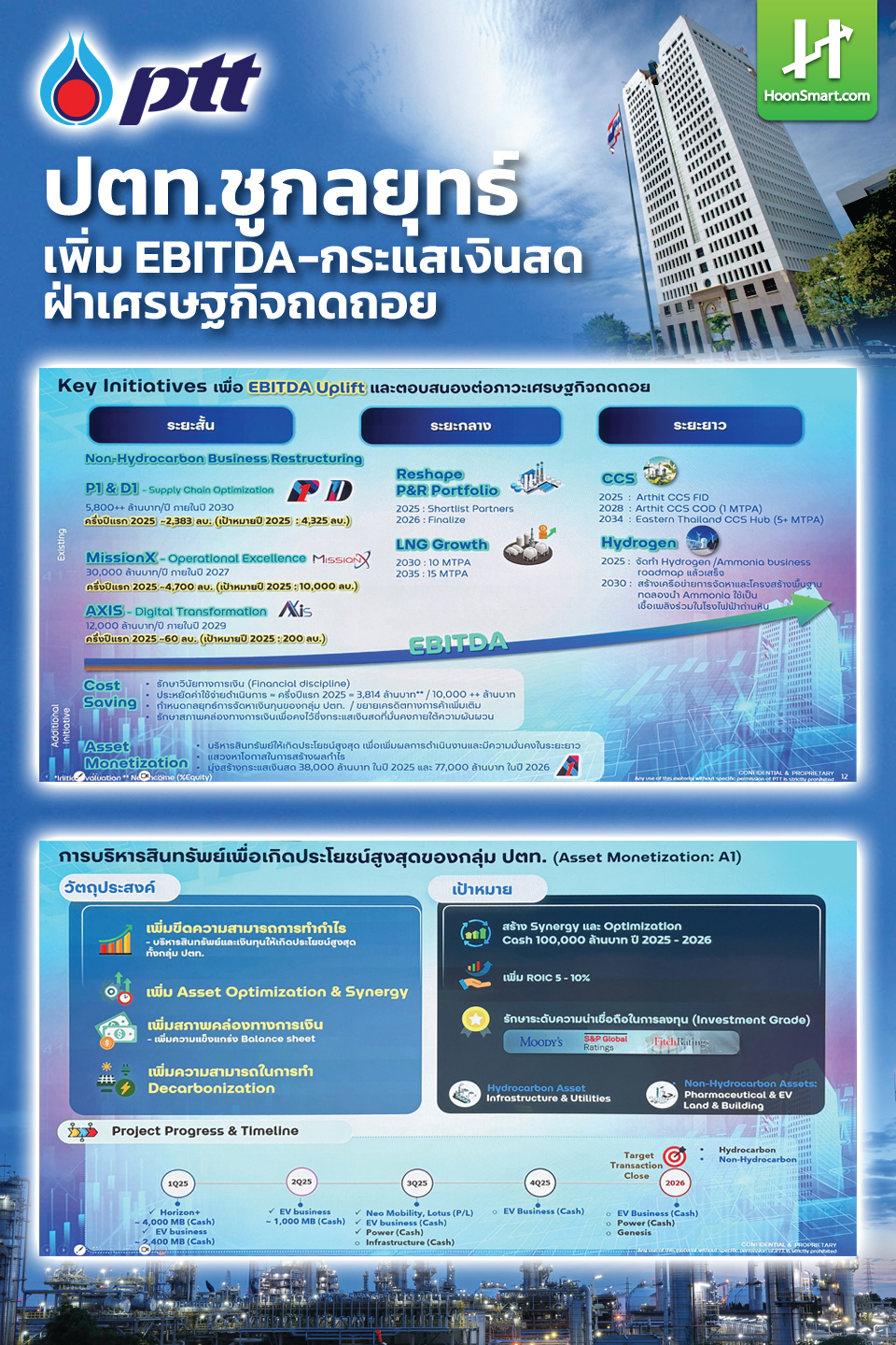4. Asset Monetization (A1) การบริหารสินทรัพย์เพื่อเกิดประโยชน์สูงสุดของกลุ่ม ปตท. เพิ่ม Asset Optimization & Synergy และปรับโครงสร้างสินทรัพย์ให้เหมาะสม ซึ่งจะเริ่มสร้างกระแสเงินสดอย่างมีนัยสำคัญในช่วงครึ่งปีหลัง รวมปีนี้จำนวน 38,000 ล้านบาท และ 77,000 ล้านบาทในปี 2569 สร้าง Synergy และ Optimization Cash 100,000 ล้านบาทในปี 2568-2569 และเพิ่ม ROIC อีก 5-10% ซึ่งในครึ่งปีแรกบริษัทได้ปรับโครงสร้างธุรกิจ EV และล่าสุดขายหุ้นในบริษัท Neo Mobility Asia ปัจจุบันเหลือธุรกิจ EV Charger ที่เป็นการร่วมมือกับบริษัทปตท. น้ำมันและการค้าปลีก (OR) เพื่อรักษาระดับความน่าเชื่อถือในการลงทุนของบริษัทในกลุ่ม โดยปตท.ได้เรทติ้งเท่ากับประเทศ
