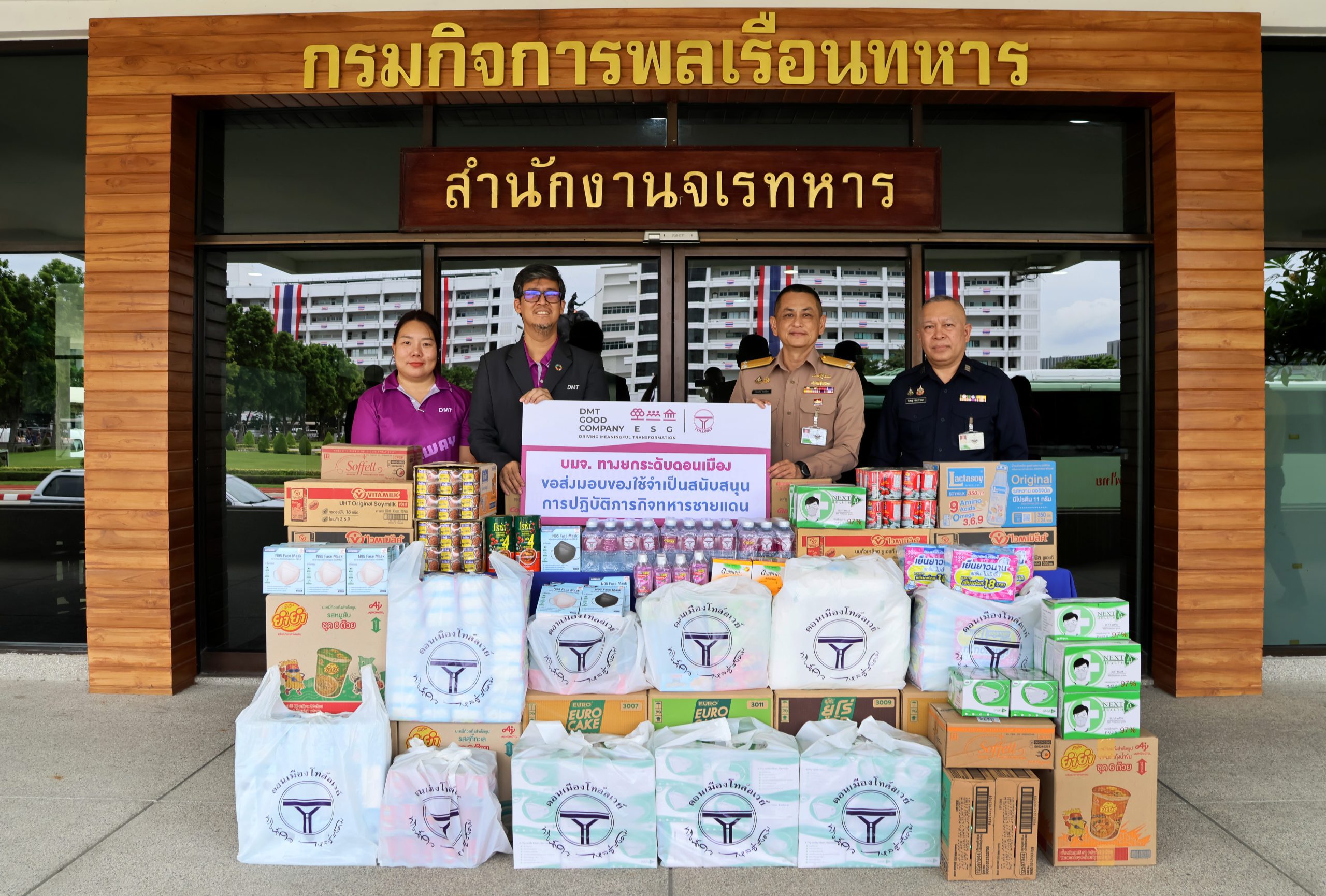 นายพลาดิสัย ใจทัศน์กุล (คนที่2จากซ้าย) ผู้จัดการแผนกสื่อสารองค์กรและกิจกรรมเพื่อสังคม บริษัท ทางยกระดับดอนเมือง จำกัด (มหาชน)  (DMT) เป็นตัวแทนบริษัท ส่งมอบสิ่งของที่จำเป็นสำหรับการปฏิบัติหน้าที่อาทิ น้ำดื่ม สินค้าอุปโภคบริโภค และหน้ากากกันกลิ่น ให้กับทหารที่ประจำการอยู่ในพื้นที่ชายแดนไทย-กัมพูชา เพื่อเป็นการสนับสนุนการปฏิบัติหน้าที่ของกำลังทหาร พร้อมทั้งส่งกำลังใจในฐานะพลังภาคีจากภาคเอกชน ที่พร้อมยืนเคียงข้างและร่วมสร้างความเข้มแข็งให้กับประเทศชาติ โดยมี พลเรือตรี ปิยะศักดิ์ นิลนิมิตร(คนที่2จากขวา) รองเจ้ากรมกิจการพลเรือนทหาร เป็นตัวแทนรับ ณ สำนักงานจเรทหาร กรมกิจการพลเรือนทหาร กองบัญชาการกองทัพไทย