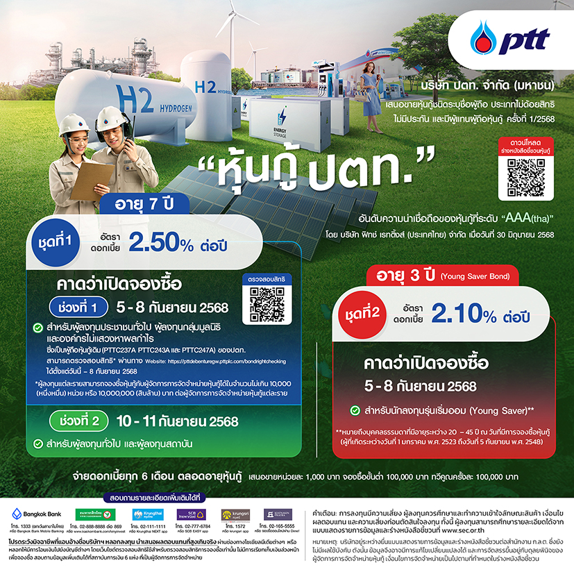 HoonSmart.com>>”ปตท.” (PTT) ประกาศอัตราดอกเบี้ยหุ้นกู้อายุ 7 ปี ที่ 2.50% ต่อปี ส่วนหุ้นกู้ Young Saver Bond อายุ 3 ปี ดอกเบี้ย 2.10% ต่อปี เสนอขาย 2 ช่วง ระหว่างวันที่ 5 – 8 ก.ย. ขายหุ้นกู้อายุ 3 ปี เฉพาะนักลงทุนรุ่นเริ่มออม ส่วนหุ้นกู้อายุ 7 ปี เฉพาะผู้ถือหุ้นกู้เดิมที่ได้รับสิทธิ ช่วงที่สองระหว่าง 10 – 11 ก.ย.68 เสนอขายหุ้นกู้อายุ 7 ปี ให้แก่ประชาชนเป็นการทั่วไป ผ่าน 6 สถาบันการเงินชั้นนำ