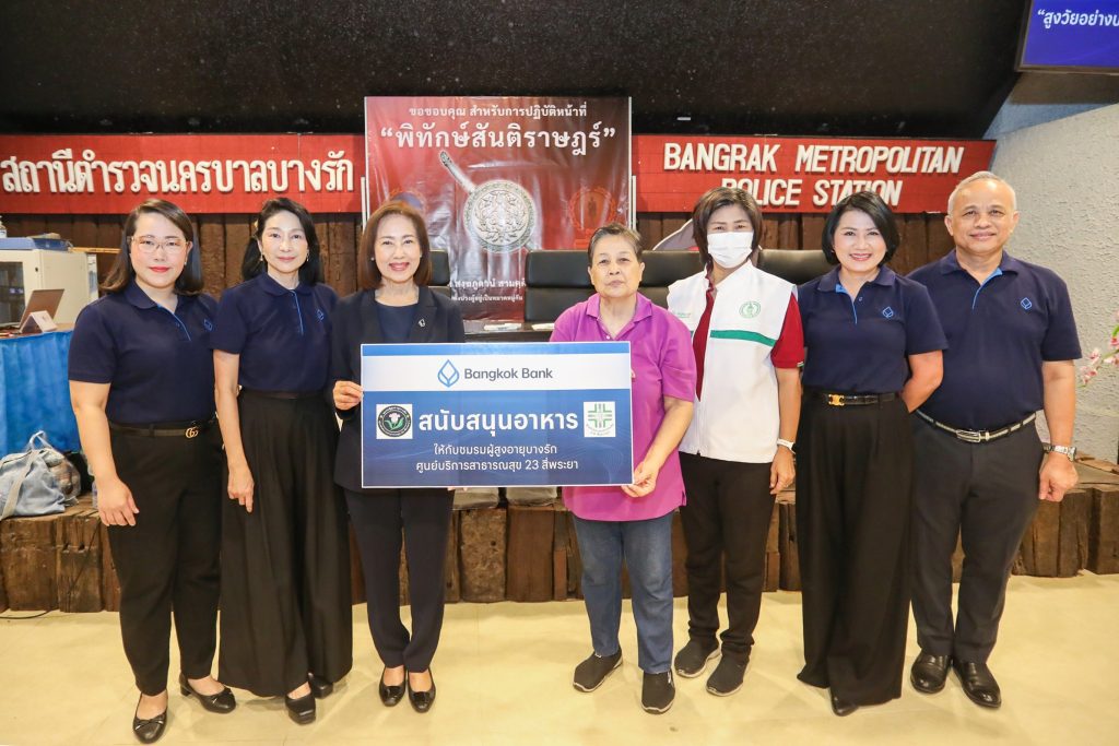 เท่าทันภัยการเงิน – นางสาวพจณี คงคาลัย ผู้ช่วยผู้จัดการใหญ่ (ที่ 3 จากซ้าย) นายสุวิทย์ อินทรเฉลิม เจ้าหน้าที่บริหารระดับ Vice President ฝ่ายการประชาสัมพันธ์ (ขวาสุด) นางรัชนี ชิรวานิช เจ้าหน้าที่บริหารระดับ Assistant Vice President ฝ่ายผู้จัดการใหญ่ (ที่ 2 จากซ้าย) นางสาวฉัตรนภา พรหมสุรินทร์ เจ้าหน้าที่บริหารระดับ Assistant Vice President ผู้จัดการสาขาสาทร (ที่ 2 จากขวา) นางสาวจิรพร เอกอธิคมกิจ ผู้จัดการสาขาถนนสี่พระยา (ซ้ายสุด) พร้อมคณะผู้บริหาร และพนักงาน ธนาคารกรุงเทพ จำกัด (มหาชน) ร่วมกับชมรมผู้สูงอายุบางรัก ศูนย์บริการสาธารณสุข 23 สี่พระยา นำโดย นางสาวกนกพร สุรางค์ศรีรัฐ ประธานชมรมผู้สูงอายุบางรัก (ที่ 4 จากขวา) และ นางสาวพยุง ลาวิณห์ นักสังคมสงเคราะห์ชำนาญการพิเศษ ศูนย์บริการสาธารณสุข 23 สี่พระยา (ที่ 3 จากขวา) จัดกิจกรรมให้ความรู้ “สูงวัยอย่างปลอดภัย : รู้ทันกลโกงมิจฉาชีพ” ภายใต้ โครงการ “เกษียณมีสุข”