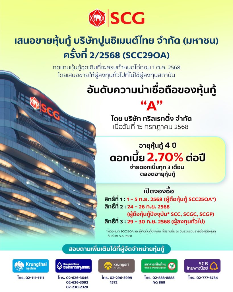 บริษัท ปูนซิเมนต์ไทย (SCC) หรือ เอสซีจี เตรียมเสนอขายหุ้นกู้ชุดใหม่ ครั้งที่ 2/2568 ของบริษัทปูนซิเมนต์ไทย จำกัด (มหาชน) “SCC29OA” จำนวน 25,000 ล้านบาท อายุหุ้นกู้ 4 ปี ครบกำหนดไถ่ถอนปี พ.ศ. 2572 อัตราดอกเบี้ยคงที่ 2.70% ต่อปี จ่ายดอกเบี้ยทุก 3 เดือน อันดับความน่าเชื่อถือหุ้นกู้ระดับ A จาก บริษัท ทริสเรทติ้ง จำกัด สะท้อนสถานะทางการเงินของเอสซีจีที่แข็งแกร่ง โดยเปิดให้จองซื้อตั้งแต่วันที่ 1 ก.ย.2568