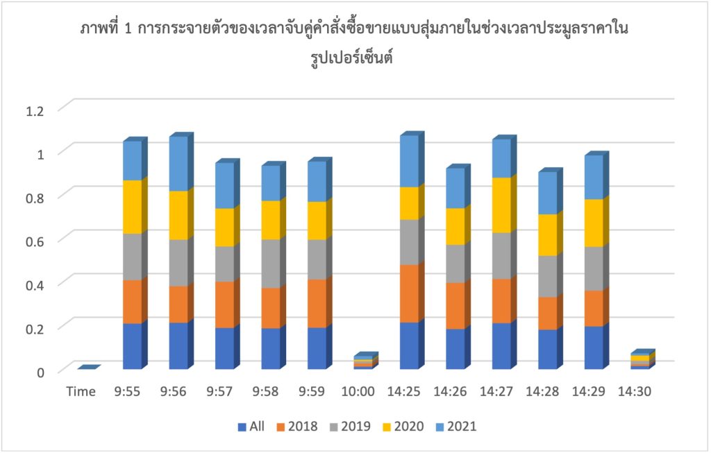 ภาพที่ 1 แสดงการกระจายตัวของเวลาจับคู่คำสั่งซื้อขายแบบสุ่มภายในช่วงเวลาประมูลราคาในรูปเปอร์เซ็นต์ระหว่างเวลา 9:55–10:00 น. สำหรับภาคเช้า และ 14:25–14:30 น. สำหรับภาคบ่าย และ แสดงให้เห็นว่าการสุ่มเวลาสิ้นสุดทั้งภาคเช้าและภาคบ่ายในตลาดหลักทรัพย์แห่งประเทศไทยมีการกระจายตัวสม่ำเสมอ ไม่มีความเอนเอียงไปทางใดทางหนึ่ง จึงบ่งชี้ได้ว่ากลไกการสุ่มเวลาเปิดนี้ทำงานตามวัตถุประสงค์ และไม่น่าจะเป็นสาเหตุที่ทำให้บทบาทของ Call Auction ในภาคเช้าและภาคบ่ายมีความแตกต่างกัน
