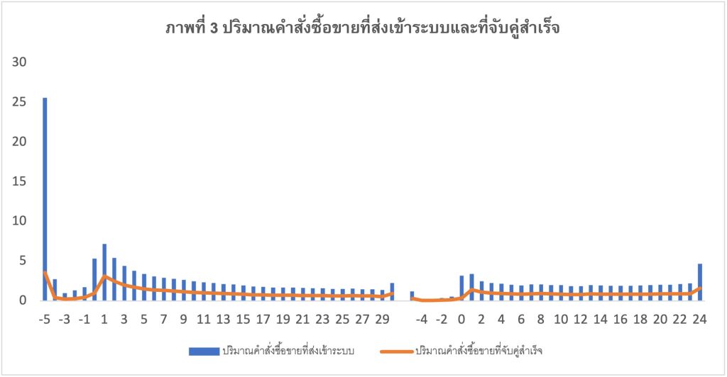 ภาพที่ 3 สะท้อนรูปแบบที่ชัดเจนของปริมาณคำสั่งซื้อขายในช่วงเช้า คำสั่งเริ่มหลั่งไหลเข้ามาจำนวนมากตั้งแต่ห้านาทีแรกของ Call Auction และกลับมาคึกคักอีกครั้งเมื่อเปิดตลาดในเวลาปกติราว 10.00 น. ตรงกันข้าม ในช่วงบ่าย ปริมาณคำสั่งใน Call Auction กลับต่ำกว่าช่วงเช้าอย่างชัดเจน และเมื่อเข้าสู่การซื้อขายปกติ ปริมาณคำสั่งก็เคลื่อนไหวค่อนข้างสม่ำเสมอ ไม่มีจังหวะเร่งตัวเหมือนภาคเช้า ภาพที่ 3 นี้แสดงให้เห็นว่า กลไกของ Call Auction เองไม่ได้มีปัญหาในทางเทคนิค เพราะระบบการจับคู่คำสั่งซื้อขายใช้แบบเดียวกันทั้งเช้าและบ่าย สิ่งที่แตกต่างคือ “บริบทของข้อมูล” และ “พฤติกรรมของนักลงทุน”