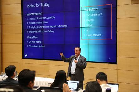 รวมถึงนำเสนอภาพรวมโครงสร้างตลาดและการซื้อขาย พร้อมทั้งชี้ให้เห็นถึงความท้าทายปัจจุบันของโครงสร้างตลาด การนำปัญญาประดิษฐ์ (AI) มาประยุกต์ใช้ในอุตสาหกรรมตลาดทุน และการเติบโตของนักลงทุนรายย่อยในสหรัฐอเมริกา เมื่อวันที่ 22 สิงหาคม 2568 ณ ตลาดหลักทรัพย์แห่งประเทศไทย โดยมี ศรพล ตุลยะเสถียร และรองรักษ์ พนาปวุฒิกุล รองผู้จัดการ พร้อมด้วยผู้บริหารตลาดหลักทรัพย์ฯ เข้าร่วมรับฟังการบรรยาย