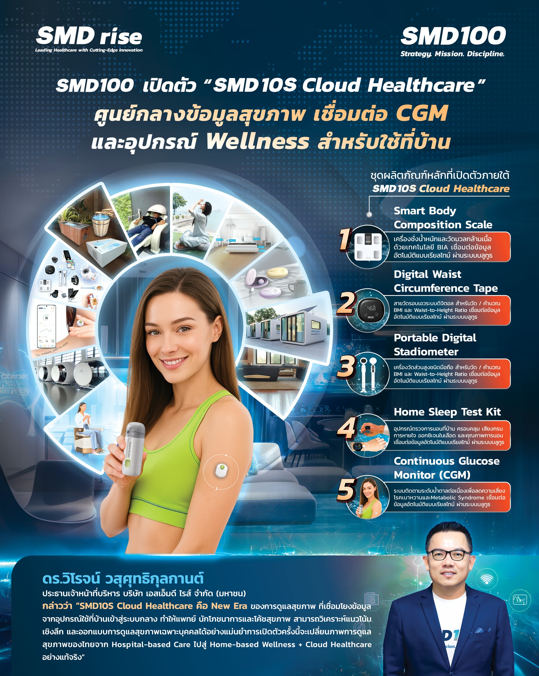 “SMD10S Cloud Healthcare คือ New Era ของการดูแลสุขภาพ ที่เชื่อมโยงข้อมูลจากอุปกรณ์ใช้ที่บ้านเข้าสู่ระบบกลาง ทำให้แพทย์ นักโภชนาการ และโค้ชสุขภาพ สามารถวิเคราะห์แนวโน้มเชิงลึก และออกแบบการดูแลสุขภาพเฉพาะบุคคลได้อย่างแม่นยำ การเปิดตัวครั้งนี้จะเปลี่ยนภาพการดูแลสุขภาพของไทยจาก Hospital-based Care ไปสู่ Home-based Wellness + Cloud Healthcare อย่างแท้จริง” ดร. วิโรจน์ กล่าวในที่สุด