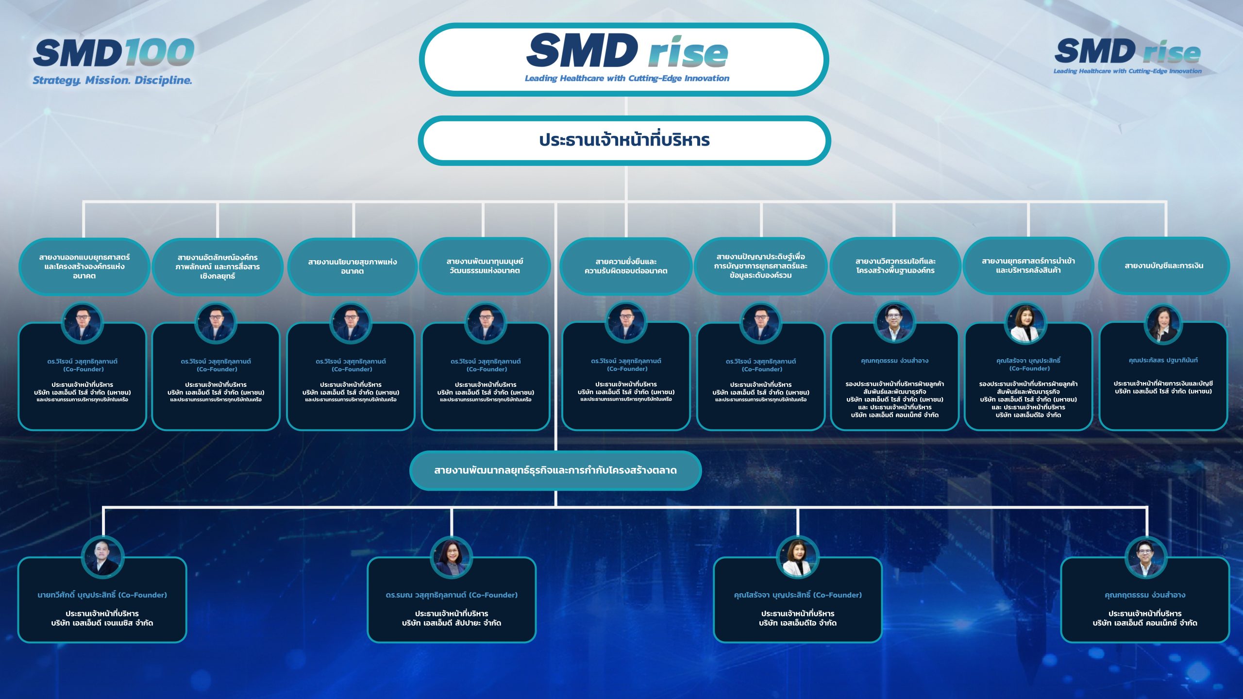 สำหัรบ SMD100 เป็นผู้นำด้าน HealthTech และ Wellness Innovation ครอบคลุมธุรกิจ Critical Care, Cardiovascular,Radiology, Wellness, Sleepverse, Smart Hospital Solutions และ Digital Health โดยมุ่งสร้างระบบนิเวศสุขภาพครบวงจรทั้งในประเทศไทยและภูมิภาคอาเซียน