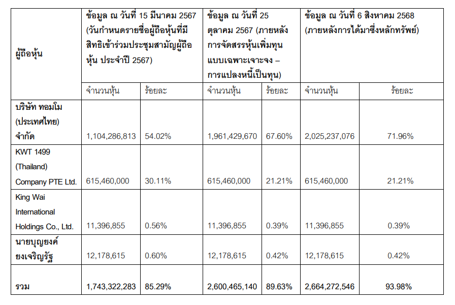 ข้อมูล ณ วันที่ 6 ส.ค.2568 (ภายหลังการได้มาซึ่งหลักทรัพย์) บริษัท ทอมโม (ประเทศไทย) ถือหุ้นสัดส่วน 71.96% จาก ณ วันที่ 25 ต.ค.2567 (ภายหลังการจัดสรรหุ้นเพิ่มทุนแบบเฉพาะเจาะจง-แปลงหนี้เป็นทุน) ถือหุ้นอยู่ที่ 67.60%